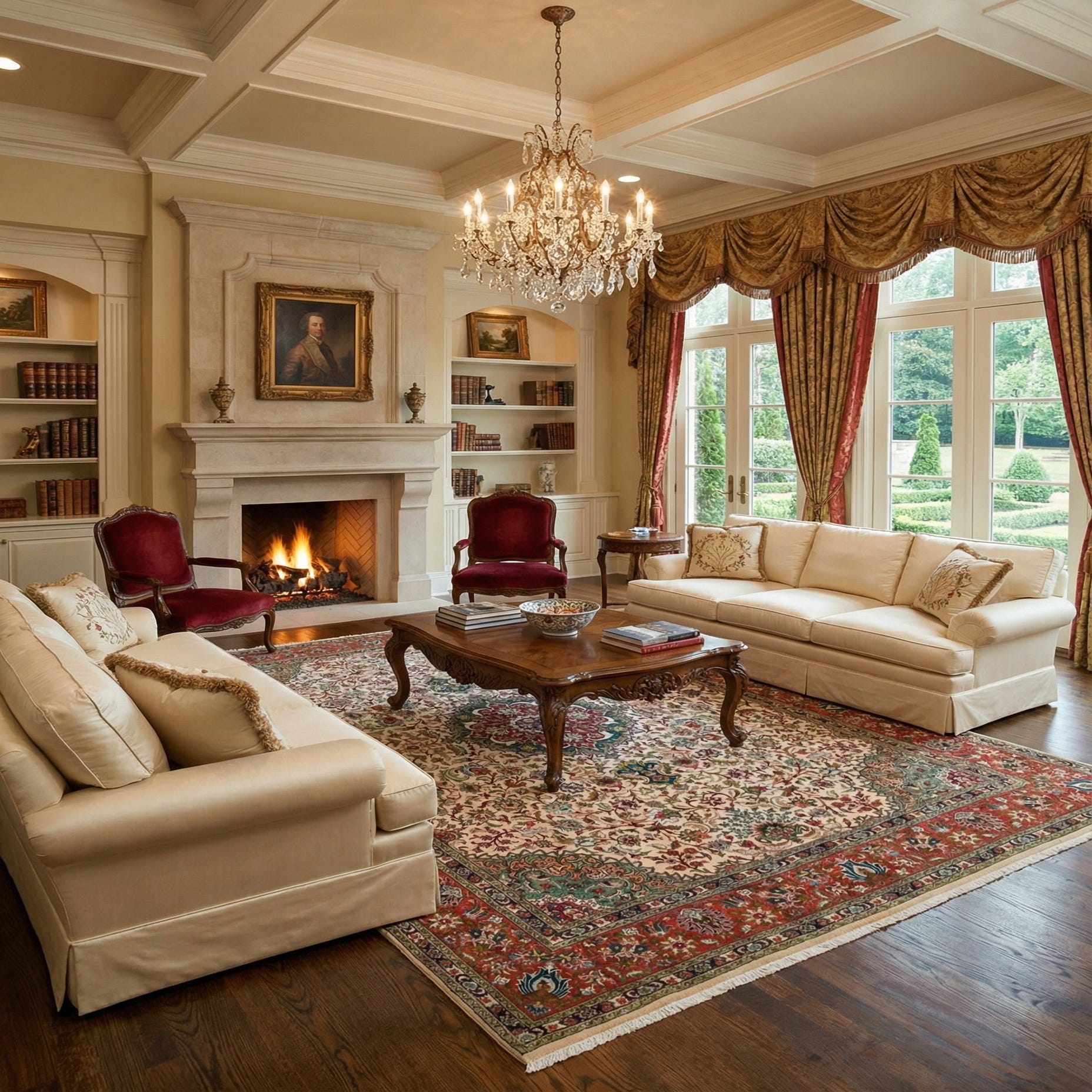 An 8x11 rectangular ivory Persian rug with a detailed red and teal medallion, surrounded by intricate botanical patterns and a wide red border.
