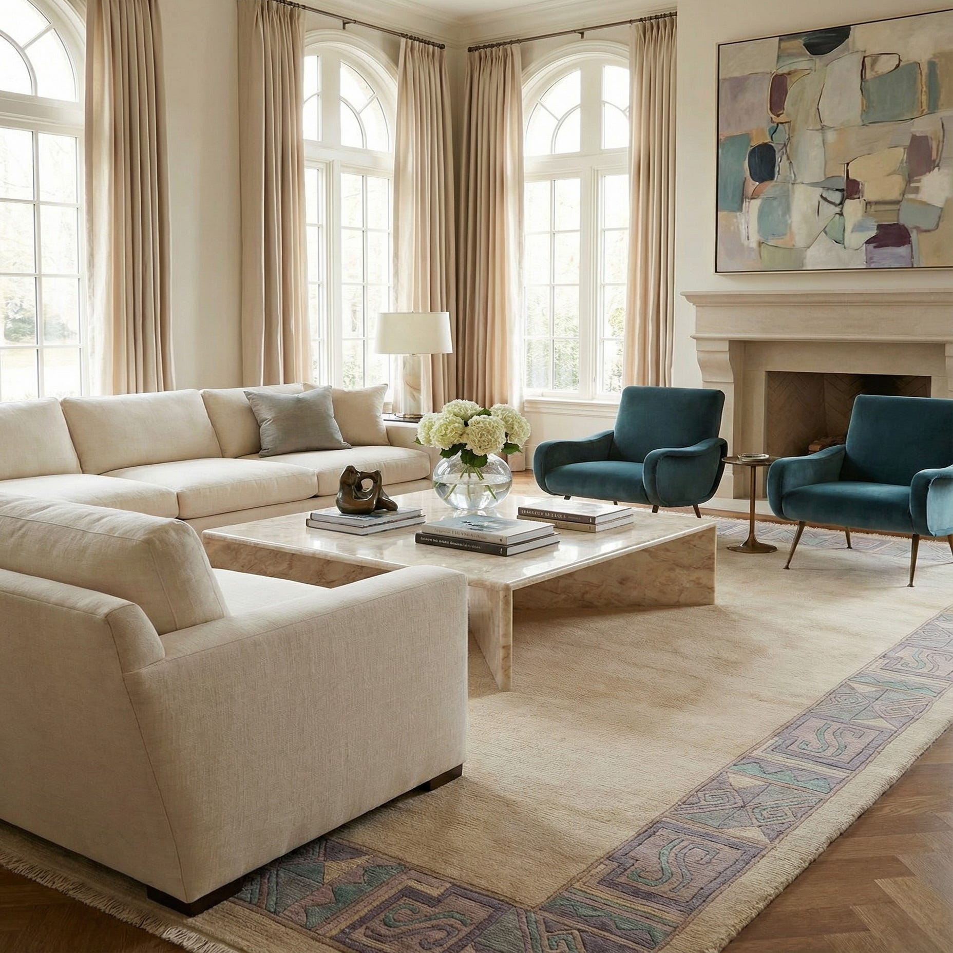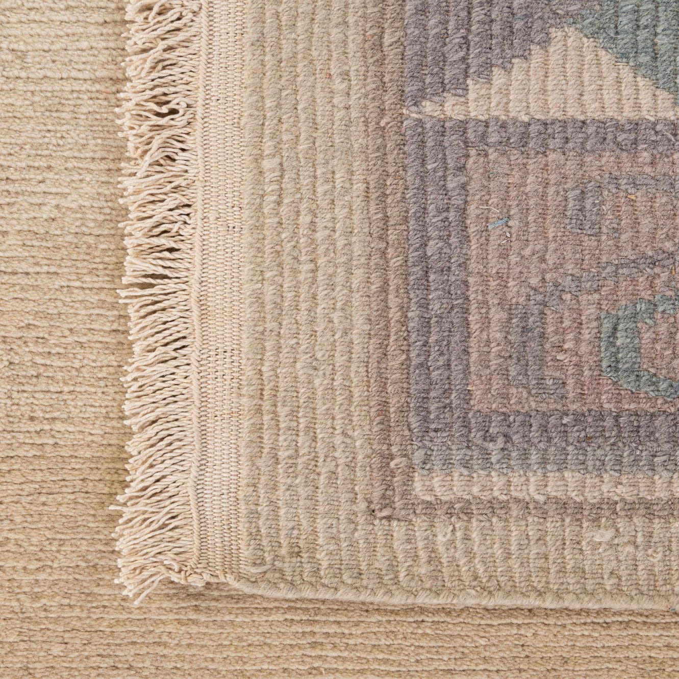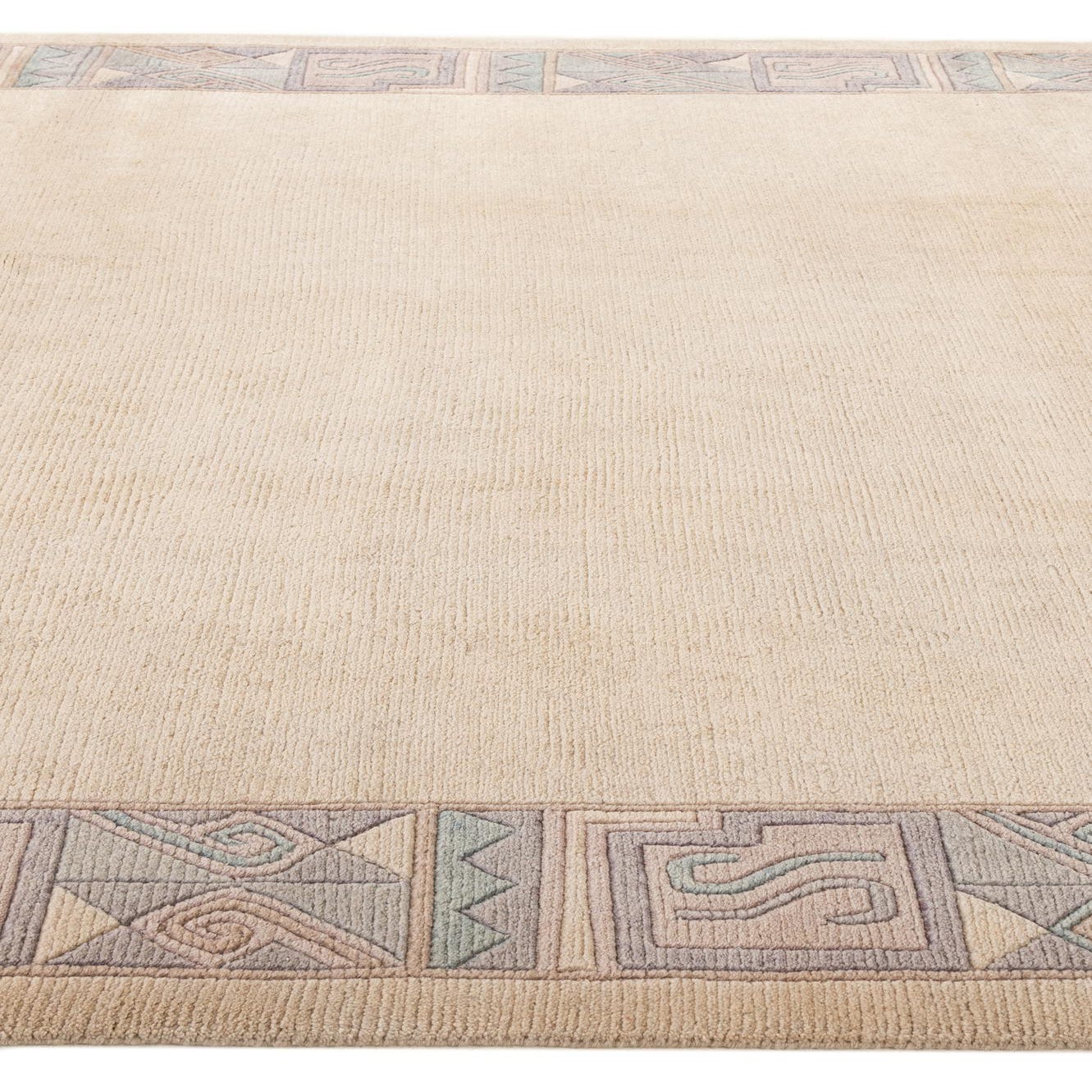 An 8x11 rectangular ivory wool rug with a modern Oriental border in muted blues, purples, and greens.