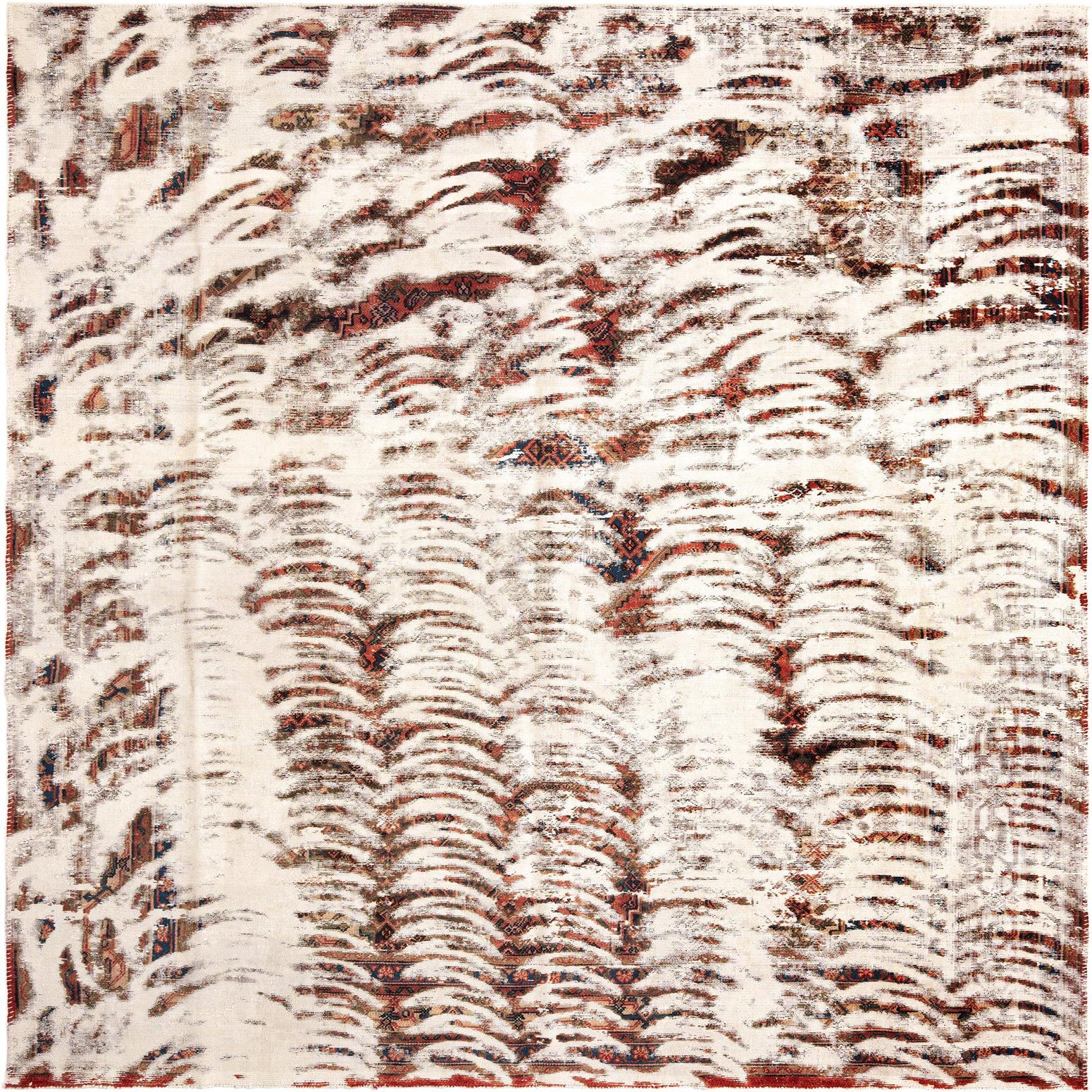 An 8x11 rectangular ivory and red Persian rug with a distressed, wave-like pattern, ideal for a living room.
