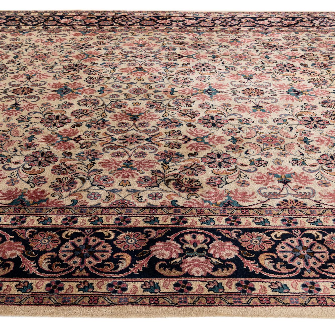 An 8x12 rectangular ivory Sarough rug with a traditional floral pattern and a dark navy border, made of wool.
