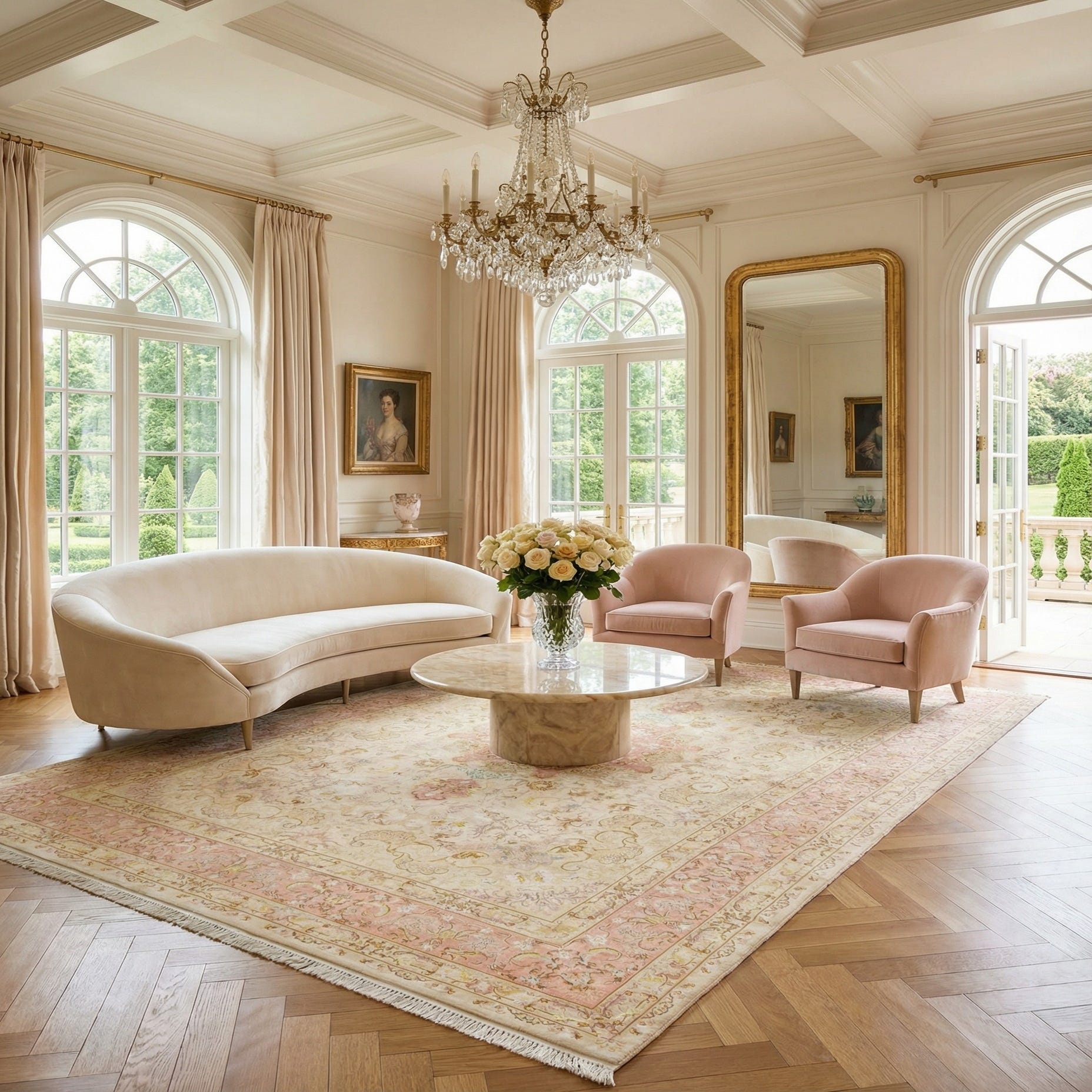 An 8x12 rectangular ivory and cream Persian rug with a traditional medallion pattern and pink floral borders.