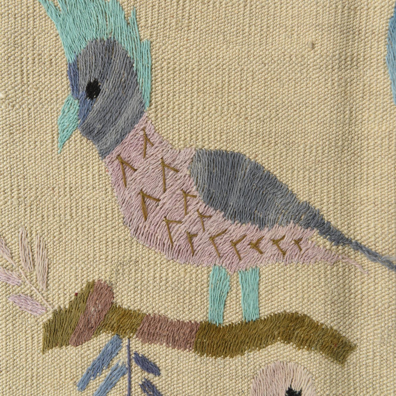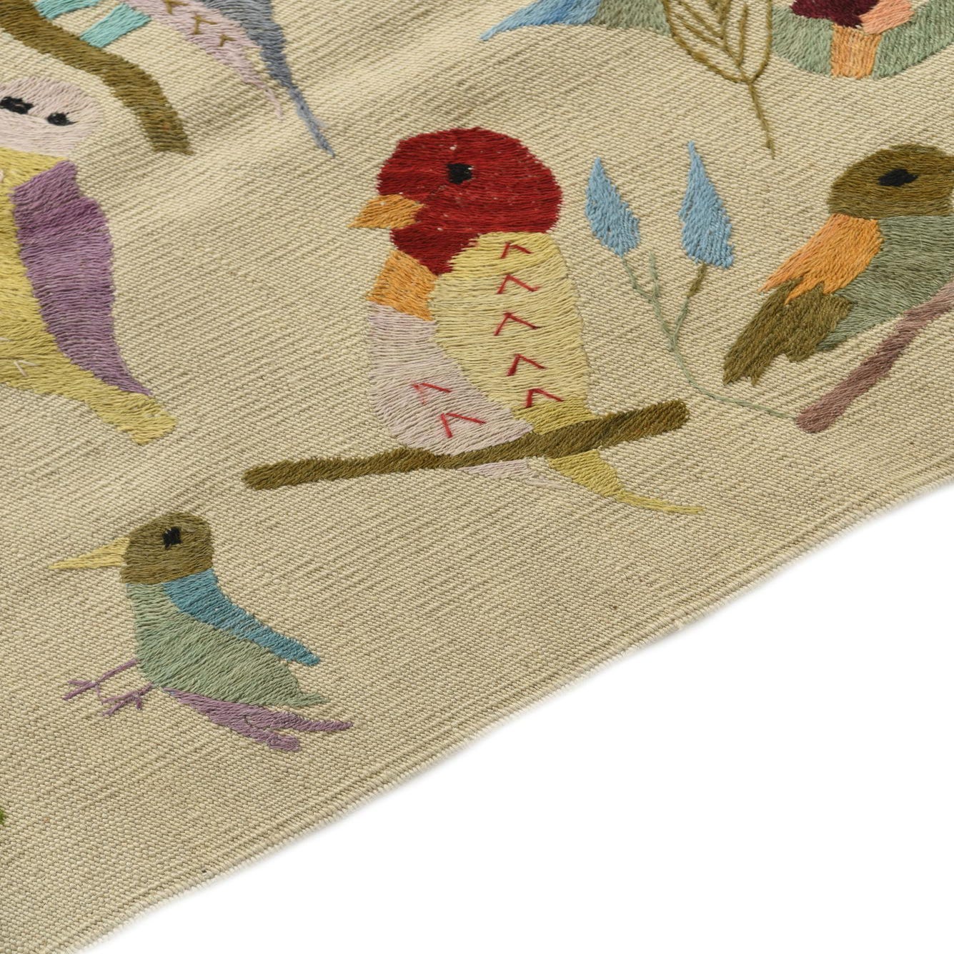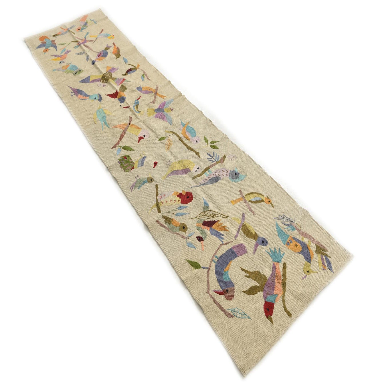 A hand-woven piece in 100% wool, this runner places stylized birds and slender branches across an ivory field. Blues and violets sit alongside olive, yellow and gold accents, creating a playful, folk-art sensibility without overwhelming the neutral background. The motifs are worked into the weave so the surface has a gentle, tactile presence—soft wool fibers with slight variation from hand craftsmanship that give the birds and leaves a subtle dimensionality against the flat ground.