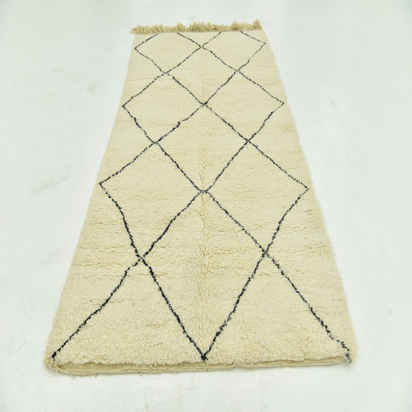 A 9 ft runner rug in ivory wool with a black tribal diamond pattern and shag pile, perfect for a hallway.