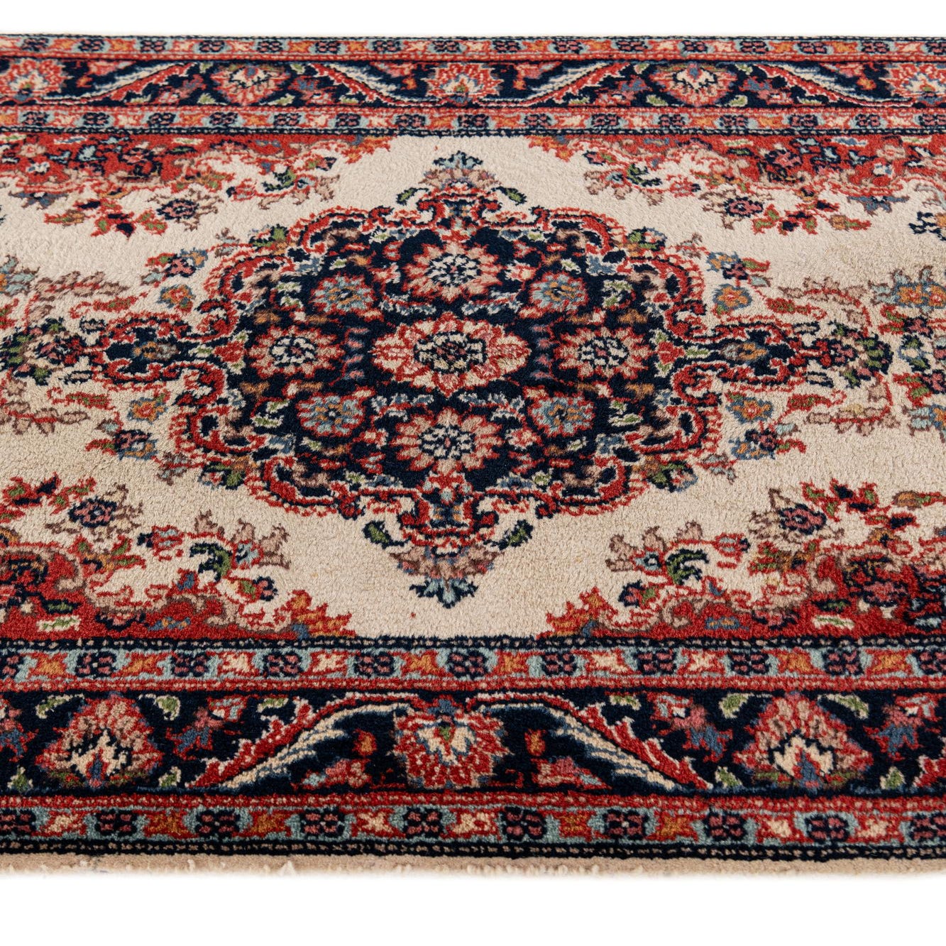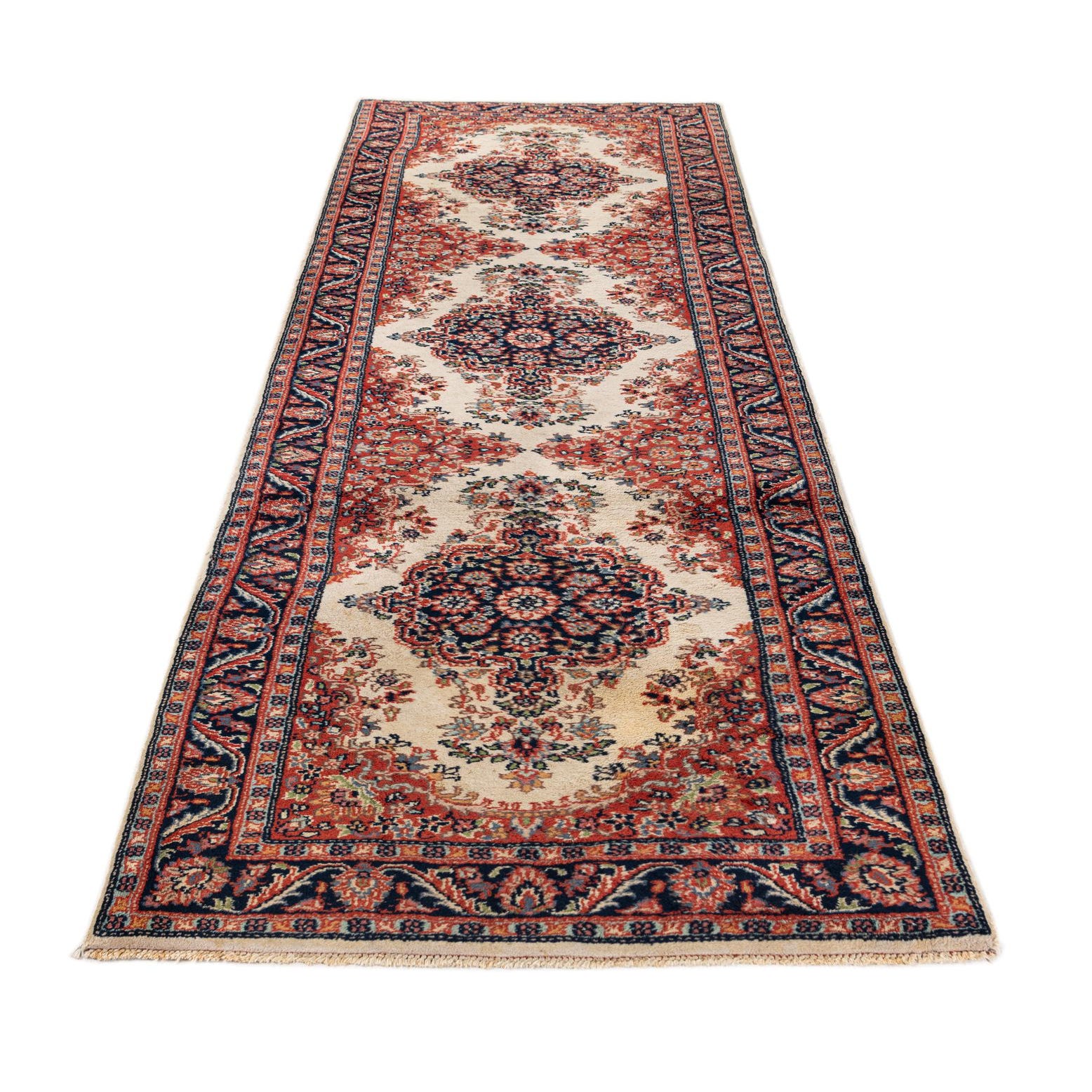 A 9 ft Sarough runner rug in ivory with a traditional oriental medallion pattern in red, navy, and cream.