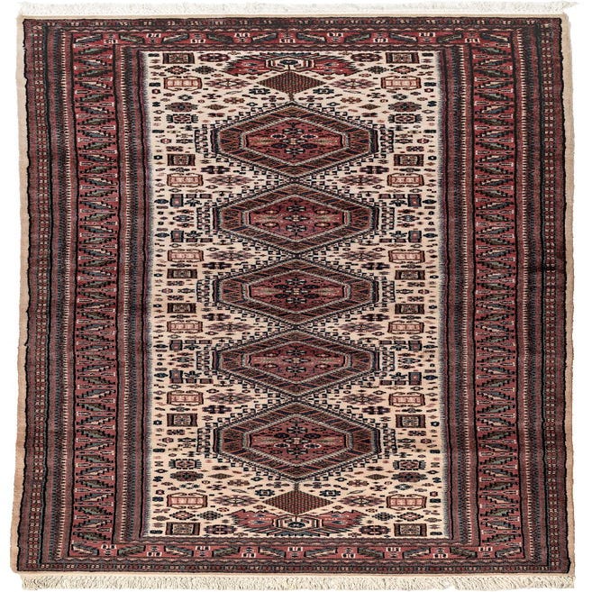 Primary color is Ivory. Colors in this rug include: Ivory, Beige, Black, Blue, Brown, Pink.