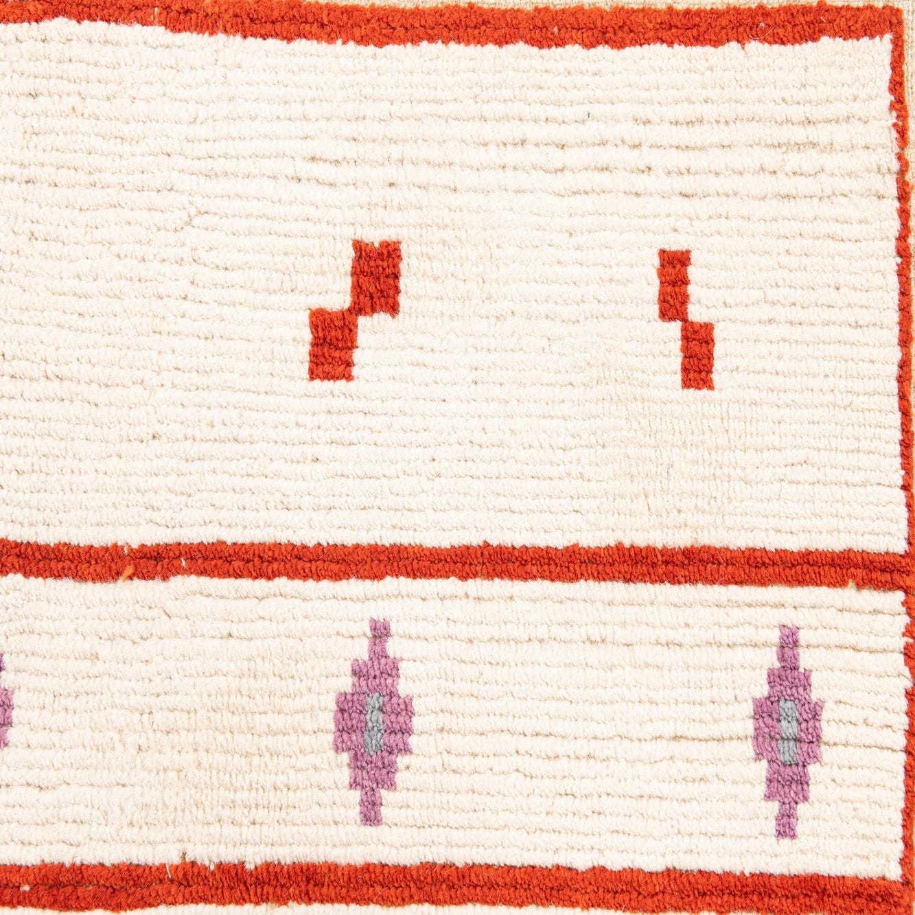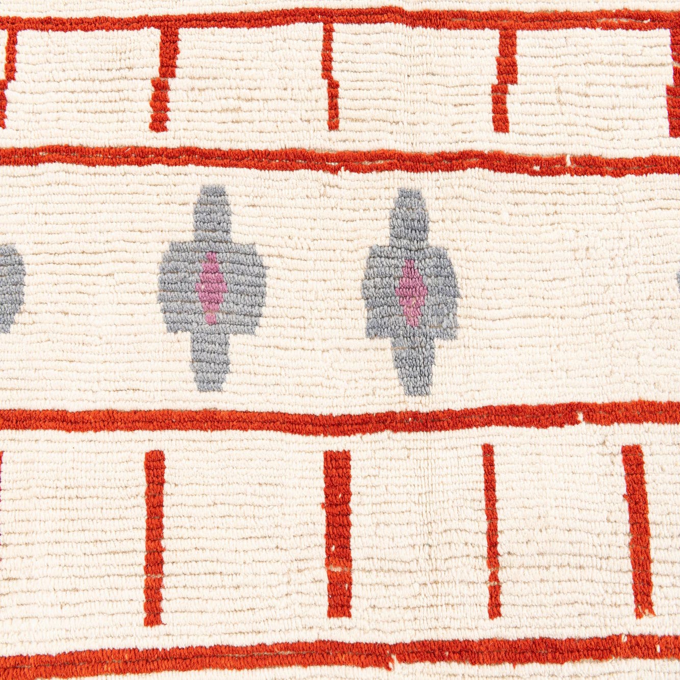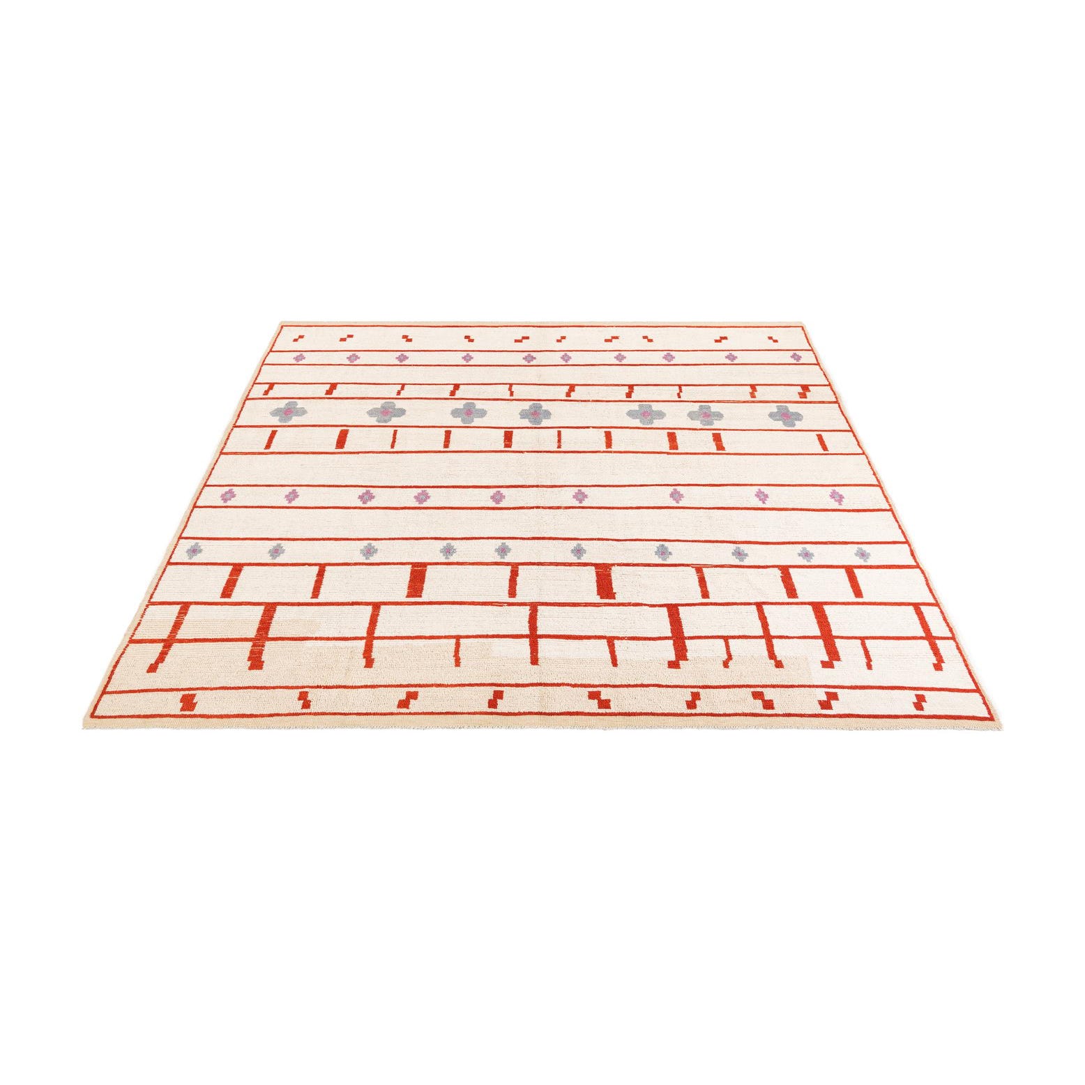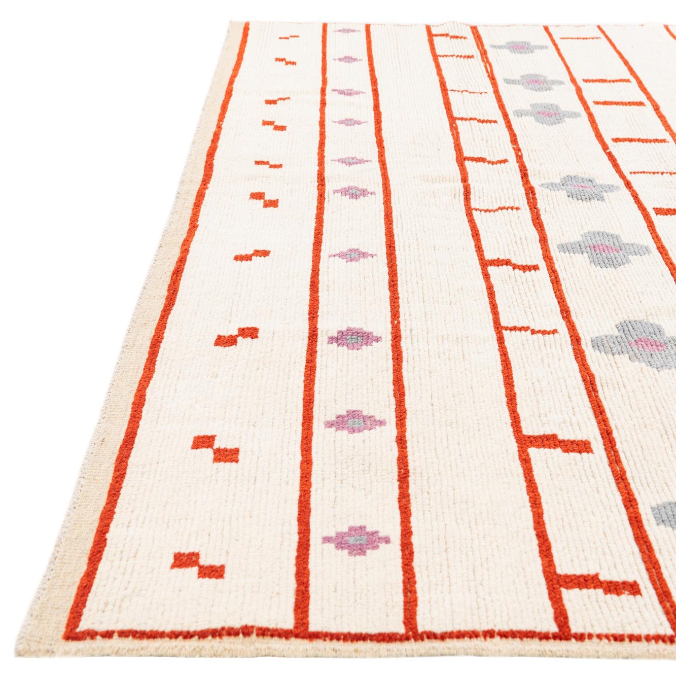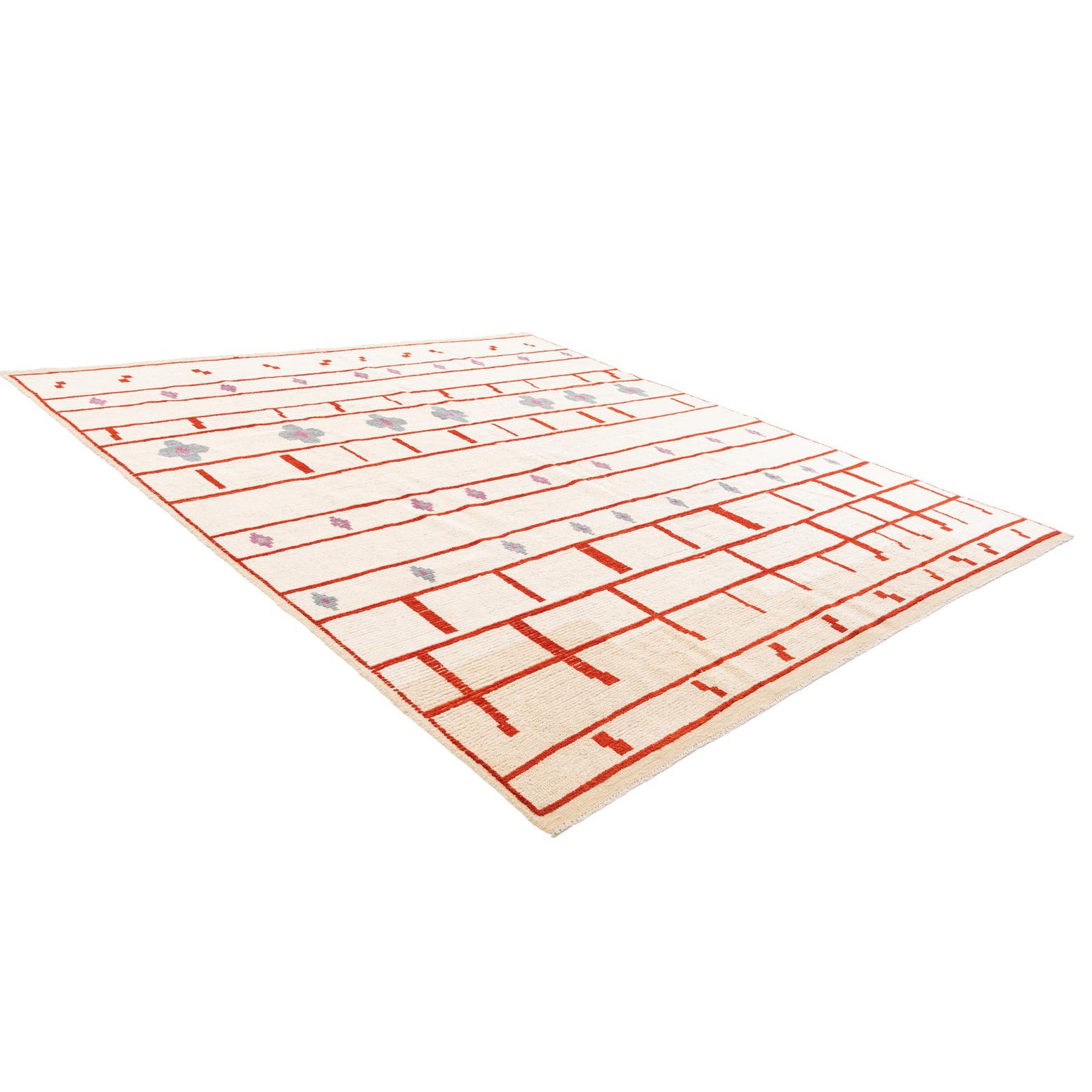 A 9x11 rectangular ivory wool rug with a modern pattern of red horizontal lines and small grey and pink floral motifs.