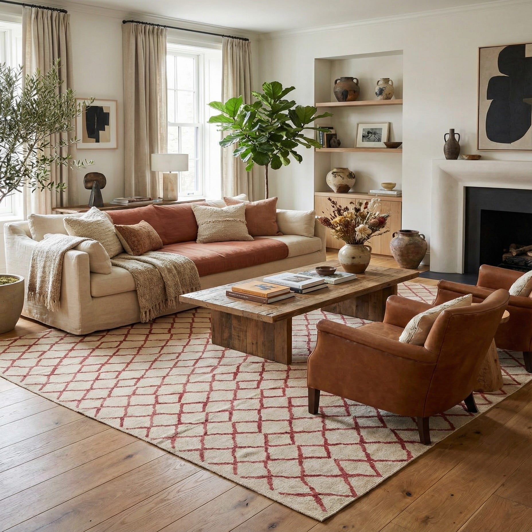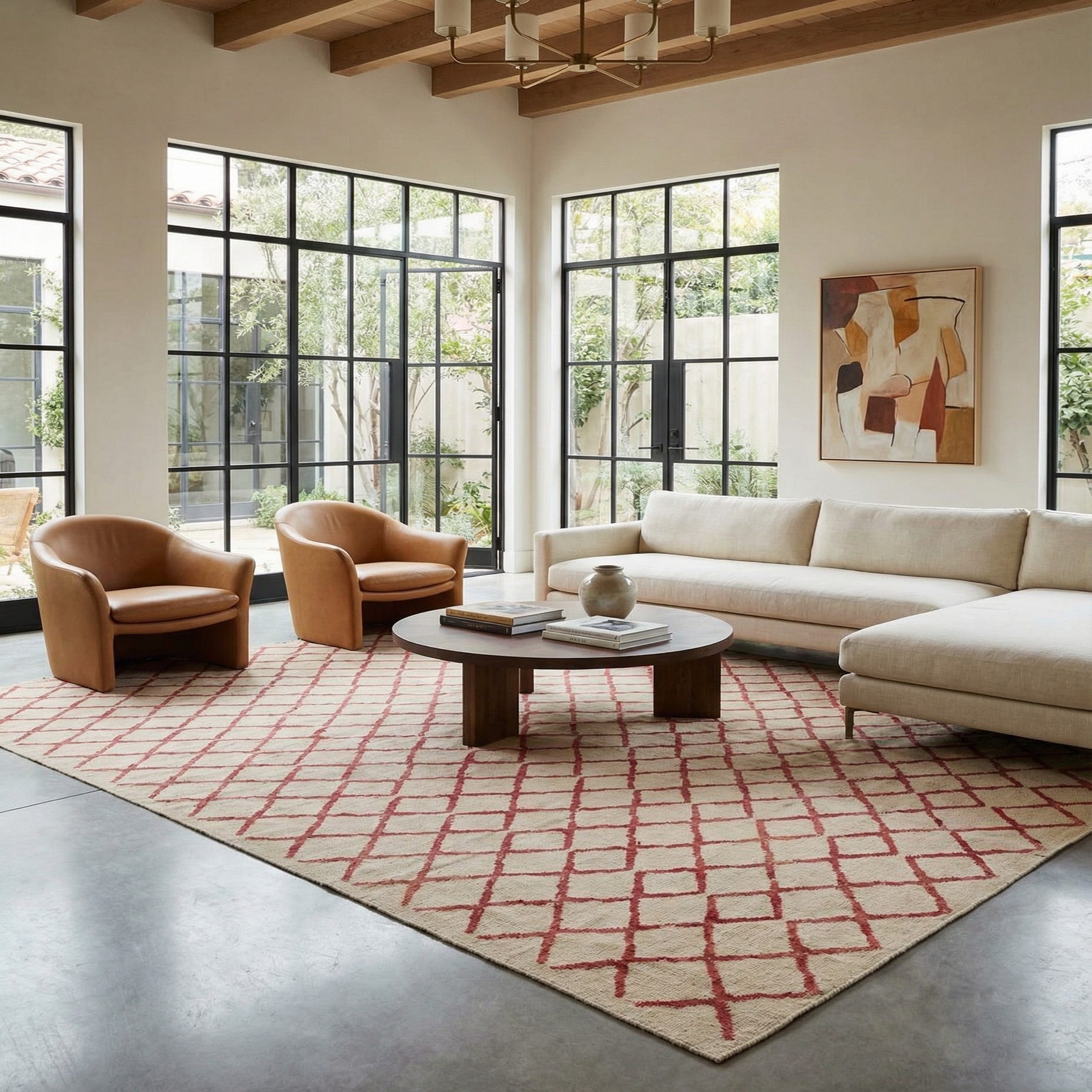 This rug fits well in modern and transitional interiors, bringing a structured, yet relaxed feel to living rooms, dining areas, or bedrooms. Pair it with natural wood furniture and neutral upholstery to let the red accents provide a calm pop, or layer it under a dining table to ground the space. It also complements Scandinavian and farmhouse sensibilities—use it to add pattern to a minimalist seating area or to soften a high-traffic entryway.