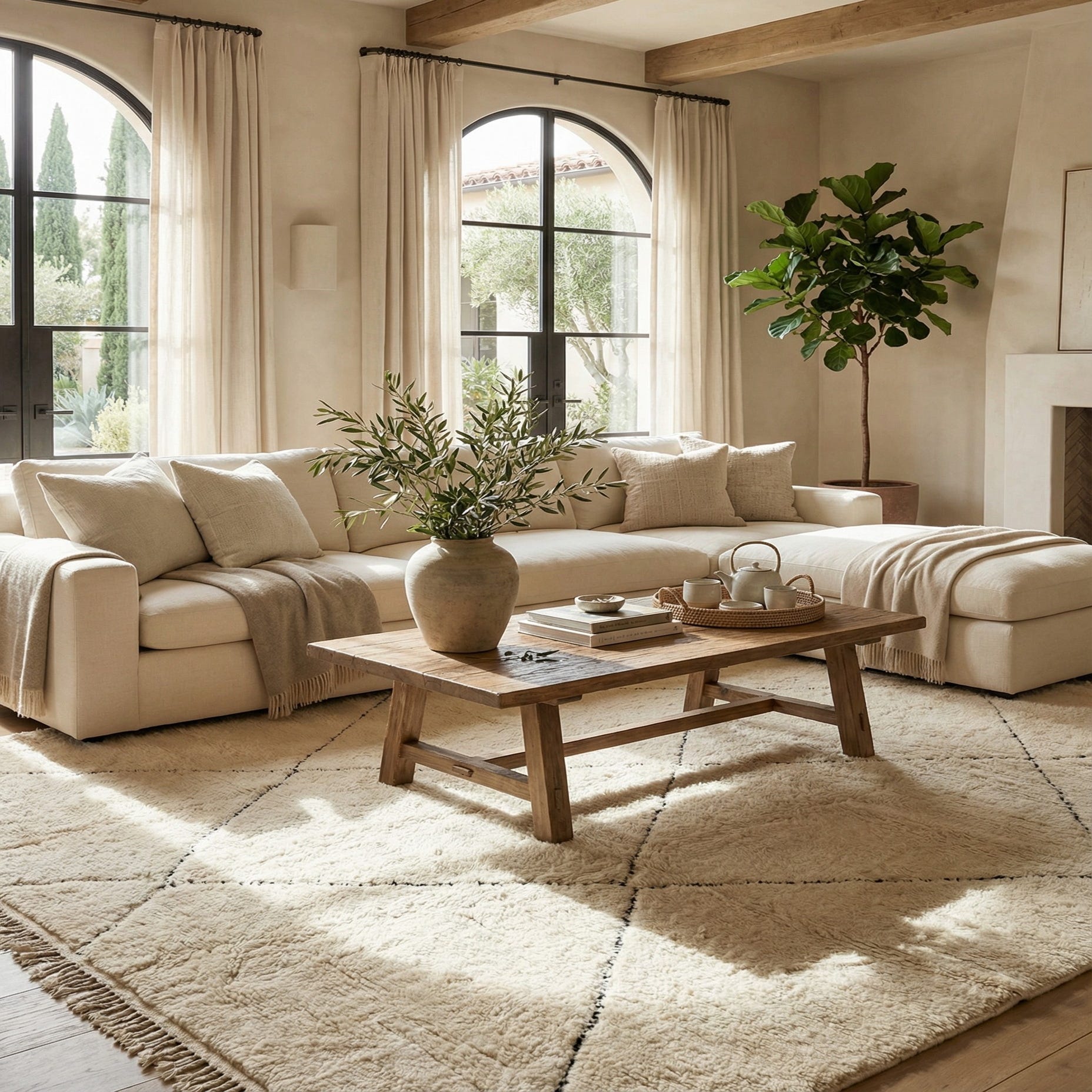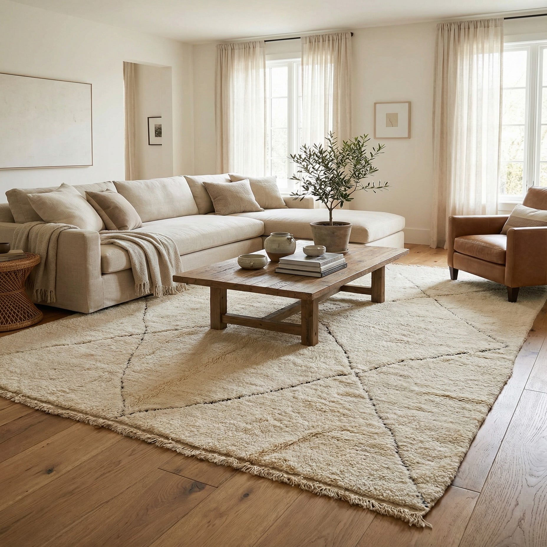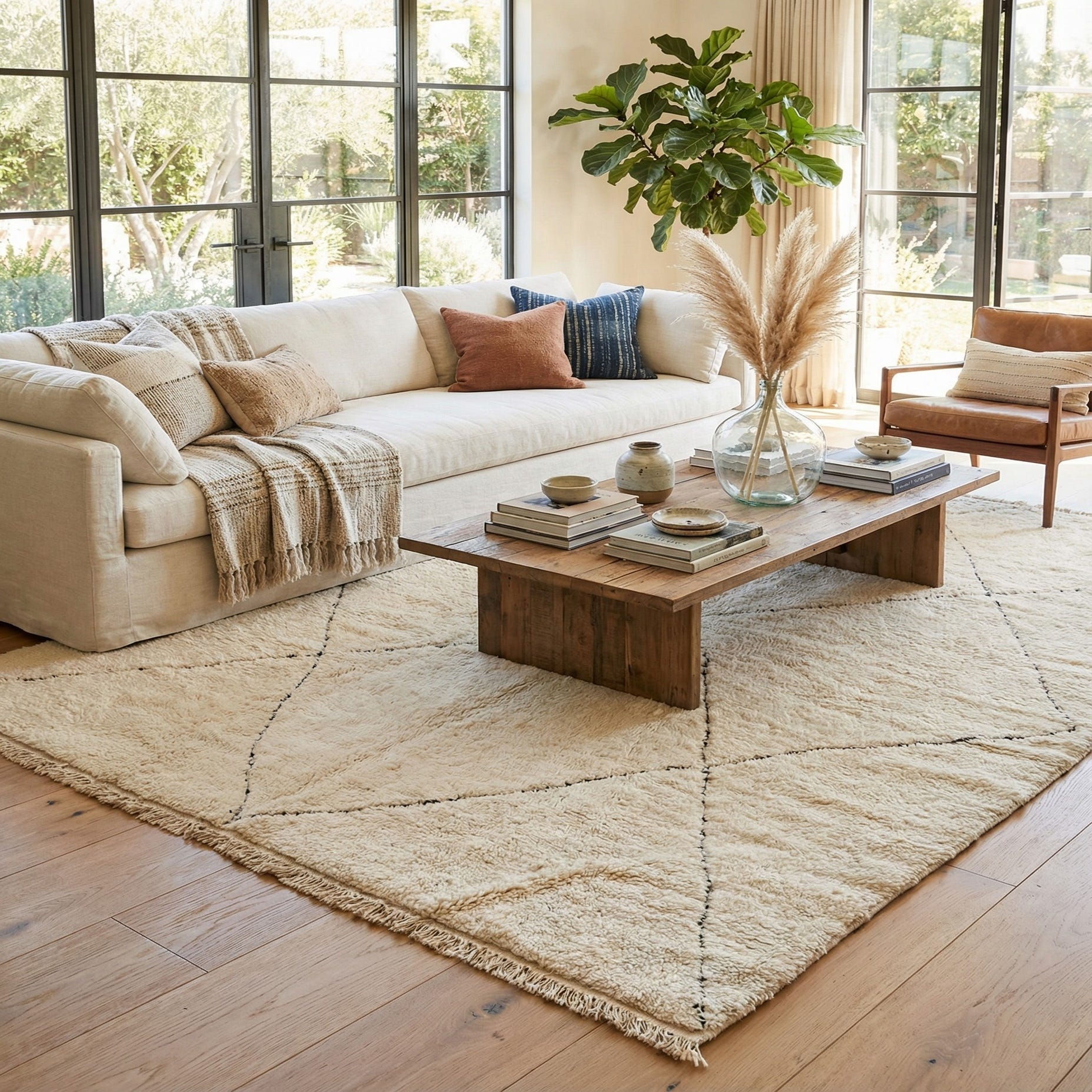 Work this rug under a low-profile sofa to anchor a living room, layer it beneath a bed to add warmth and softness to a bedroom, or place it in a reading nook for a cozy foundation. Its neutral ivory and black palette pairs well with Scandinavian and minimalist schemes, modern farmhouse or soft boho looks, and with warm wood tones, leather seating, or matte black metal accents.