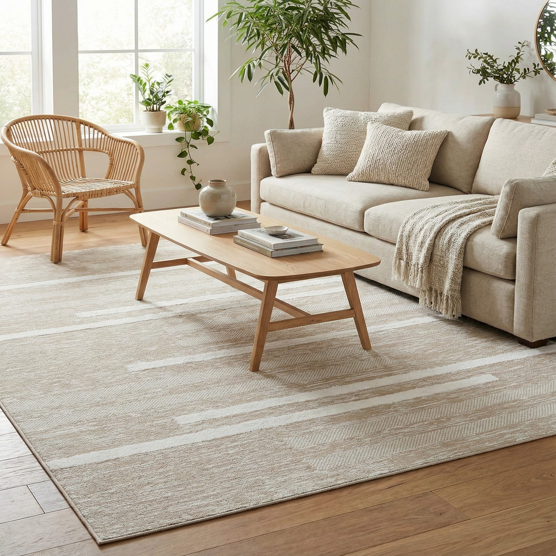 This rug works well in modern and transitional interiors where a light, neutral foundation is needed. Place it beneath a sofa and coffee table in a bright living room, layer it under a bed with linen bedding for a relaxed bedroom look, or use it to soften a dining area with pale wood furniture. It also pairs nicely with Scandinavian, coastal, or minimalist schemes that favor natural textures and muted tones.