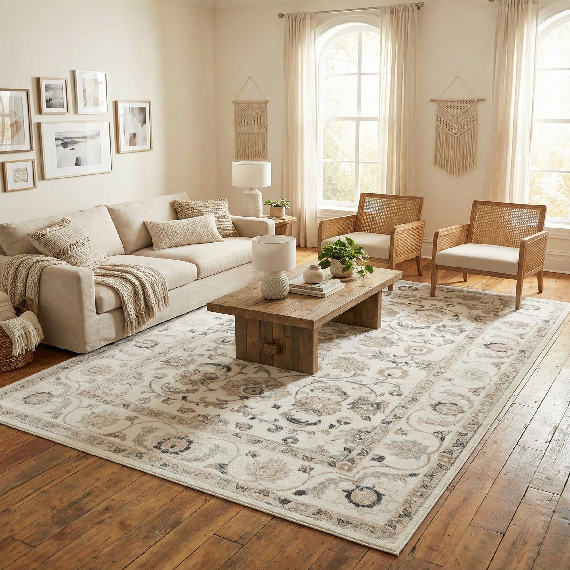 This rug works well to anchor a living room seating arrangement or to sit beneath a dining table, bringing a refined traditional influence without feeling heavy. It pairs naturally with warm wood tones, matte brass or black metal accents, and neutral upholstery, and complements transitional, modern farmhouse, or coastal interiors that favor a soft, layered palette. Use it to add pattern and muted color to a bedroom or to introduce a comfortable, grounded layer in an open-plan space.