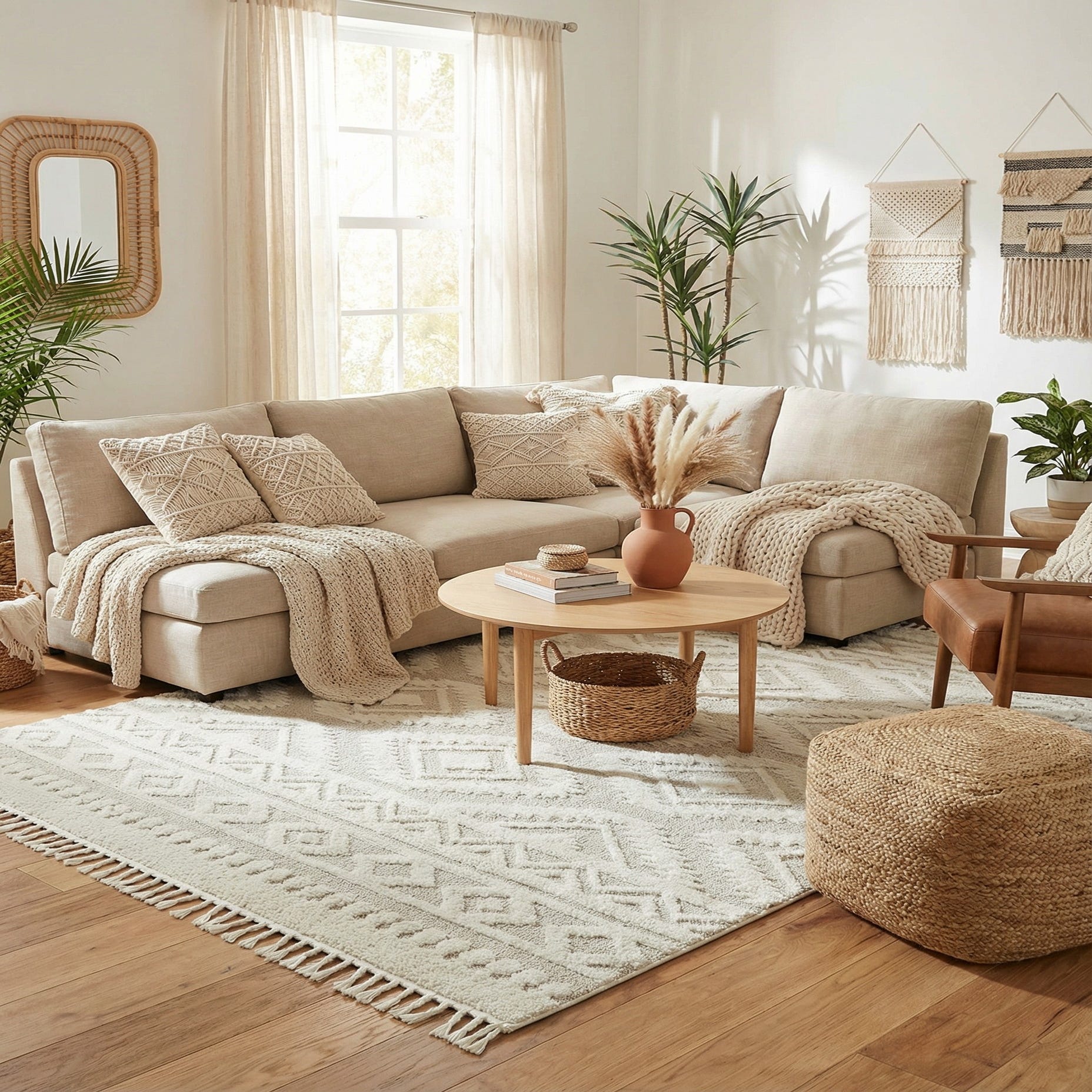 A 9x12 rectangular ivory and cream Southwestern rug with a tribal diamond and trellis pattern, featuring tassels on the ends.