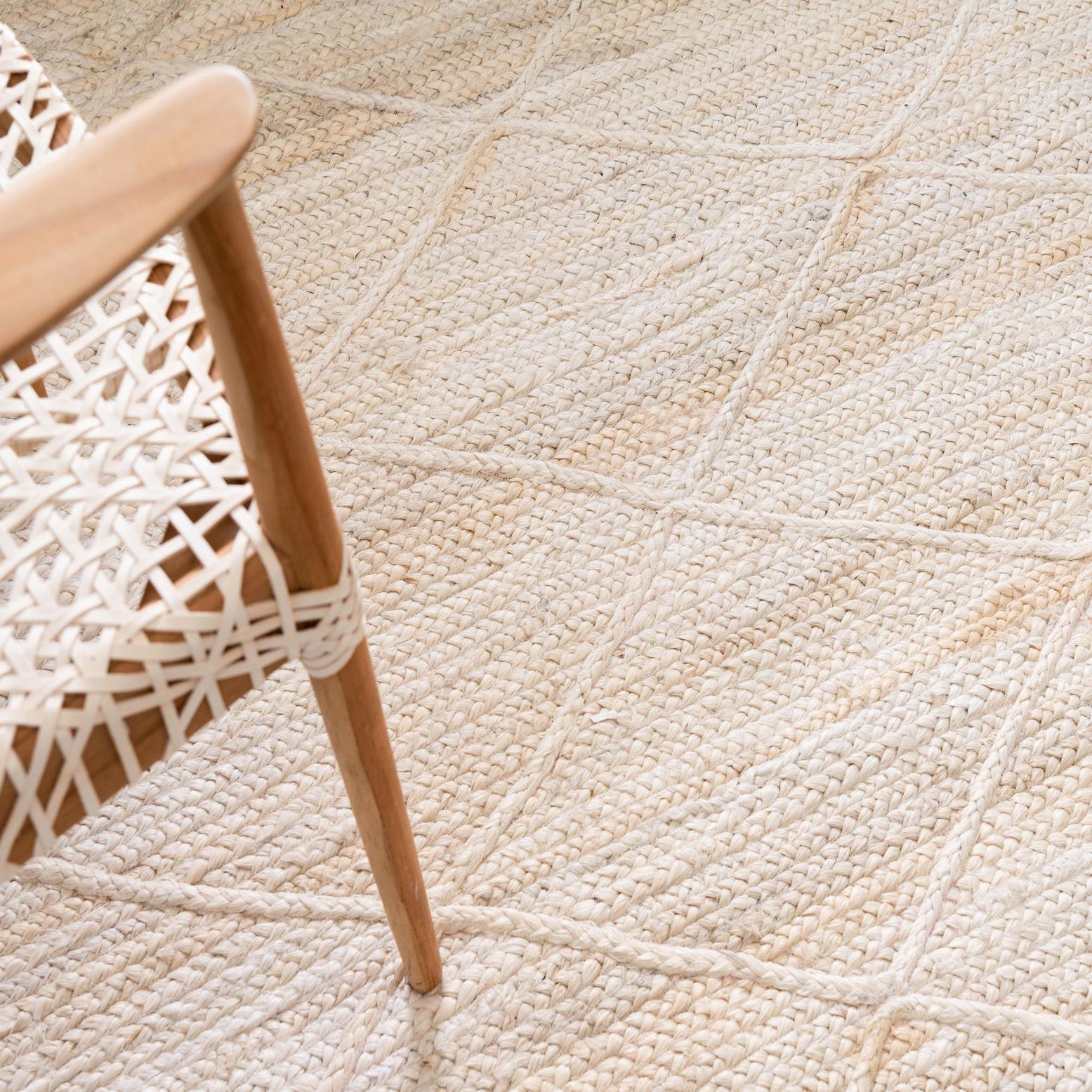 Hand-braided from 100% jute, this rug shows a simple diamond-lattice pattern worked into an ivory field. The raised braided lines create a subtle geometric texture against the naturally variegated jute background, where soft tan and warm beige fibers add gentle depth and organic variation to the surface.