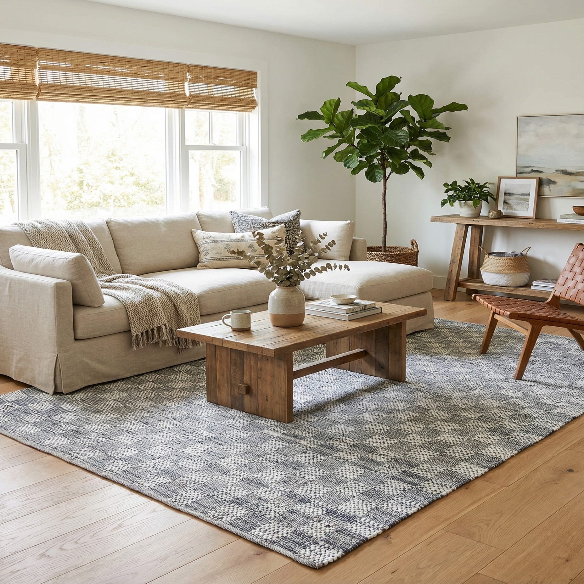 The neutral palette and understated pattern make this piece versatile: it can anchor a casual, modern living room without competing with bold furniture, sit neatly beneath a dining table to balance wood tones, or warm up a minimalist bedroom while keeping the look light. It also works well in coastal, Scandinavian, or contemporary farmhouse interiors where layered textures and simple color stories are welcome.
