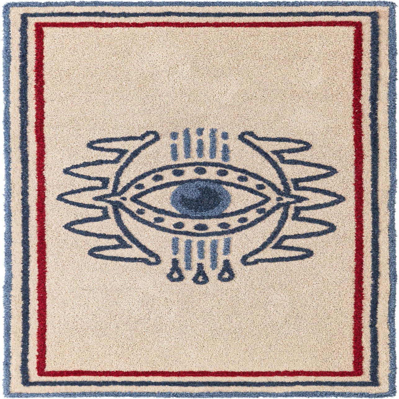Primary color is Ivory. Colors in this rug include: Ivory, Blue, Red, Navy Blue.