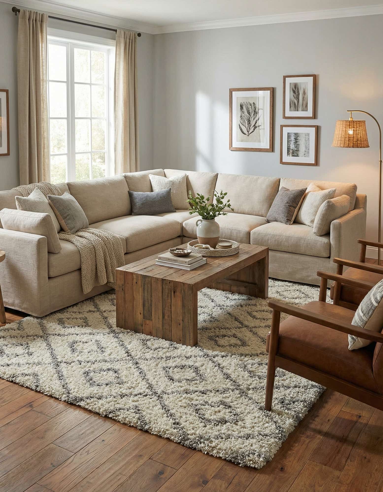 This rug works well in a variety of interiors: layer it beneath a low-profile sofa and coffee table for a casual living room, place it under a bed to add warmth and softness to a bedroom, or set it in a reading nook to create a cozy focal point. Its neutral ivory and gray palette pairs easily with Scandinavian, transitional, or modern farmhouse decor, and it complements both light wood and painted finishes for versatile styling.