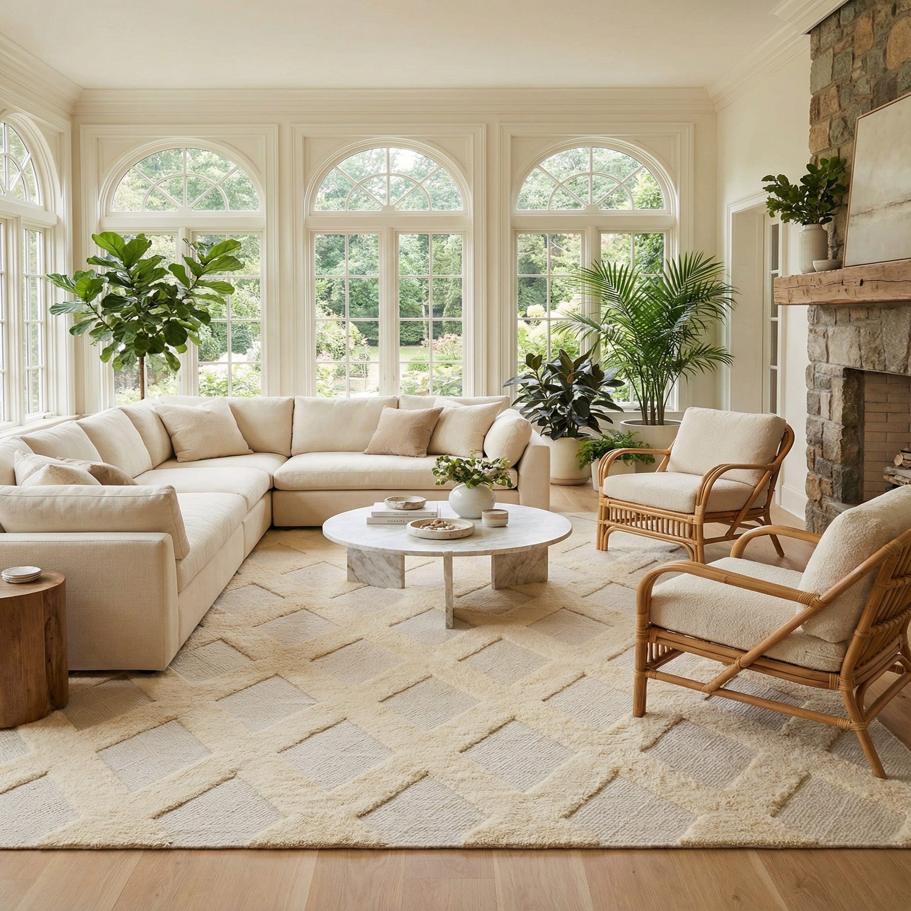 This rug works well in calm, modern spaces where texture is the focal point: place it beneath a coffee table to anchor a neutral living room, lay it at the foot of a bed to add softness to a serene bedroom, or use it in a sitting area paired with light woods, linen upholstery and muted metallic accents. Its understated pattern and ivory palette complement Scandinavian, transitional, modern farmhouse or coastal interiors that favor light, airy layers and natural materials.