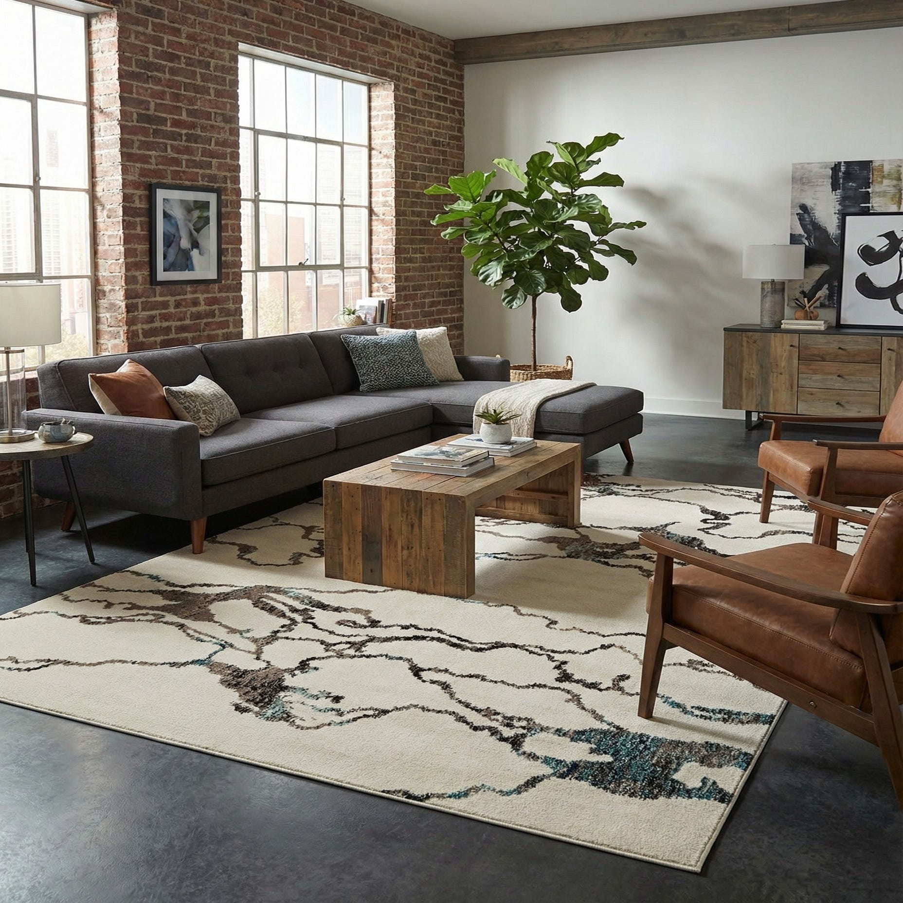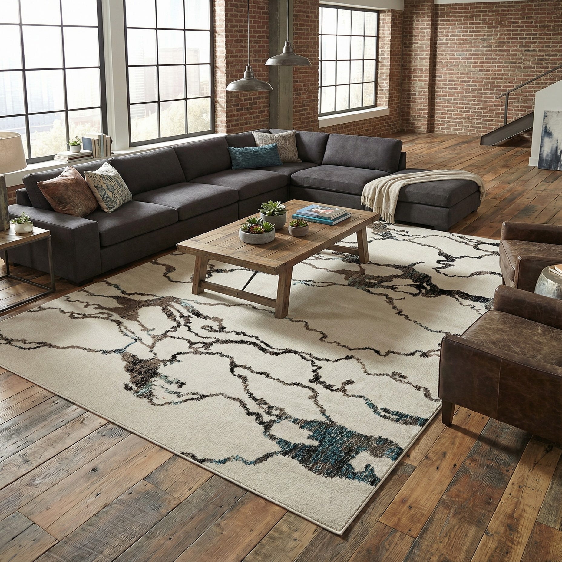 Primary color is Ivory. Colors in this rug include: Ivory, Beige, Light Blue, Navy Blue, Teal.