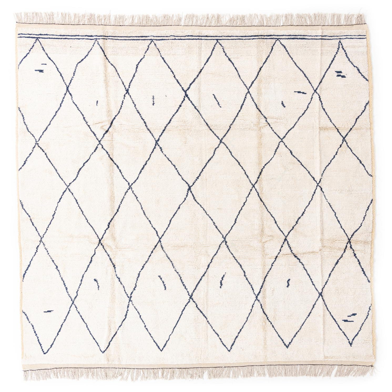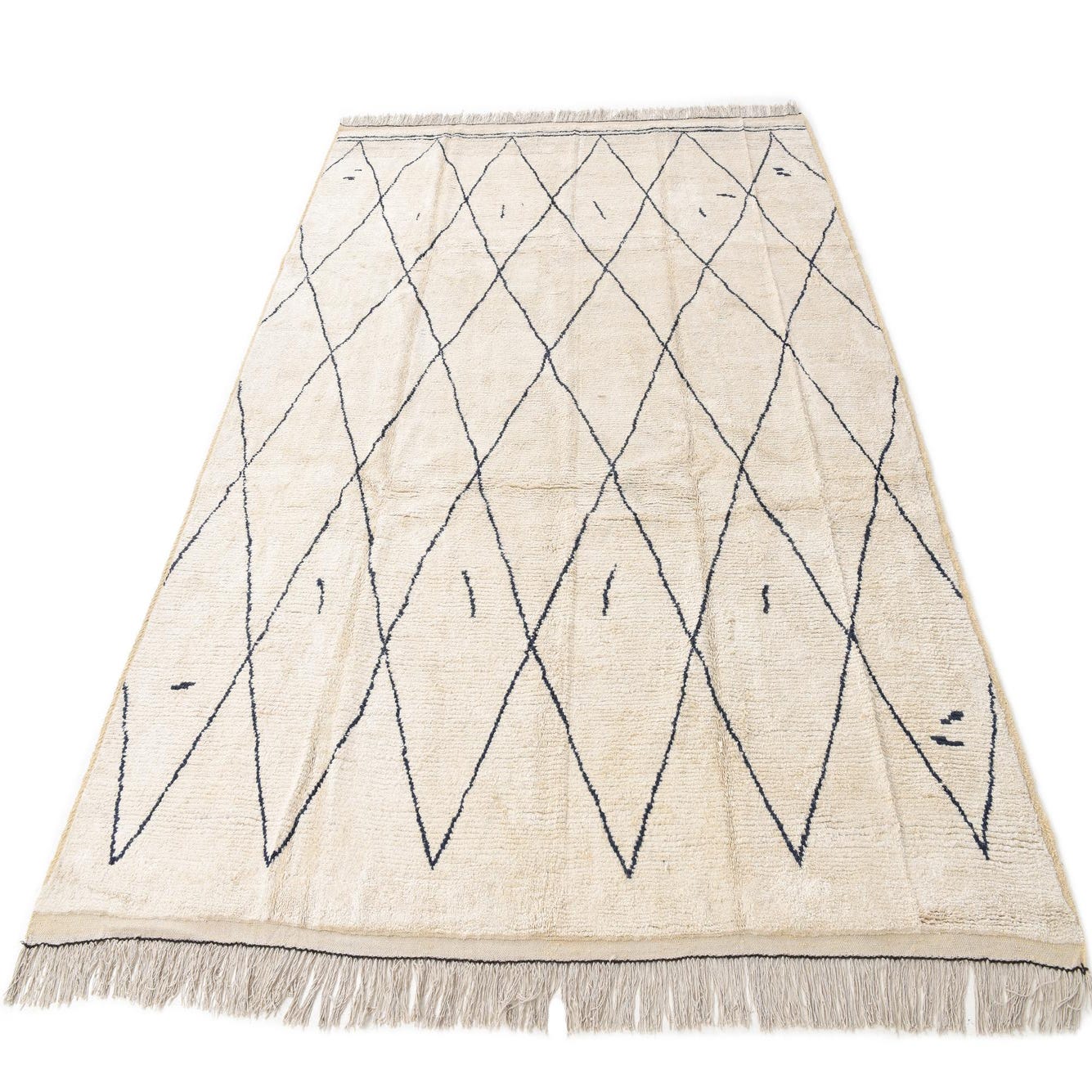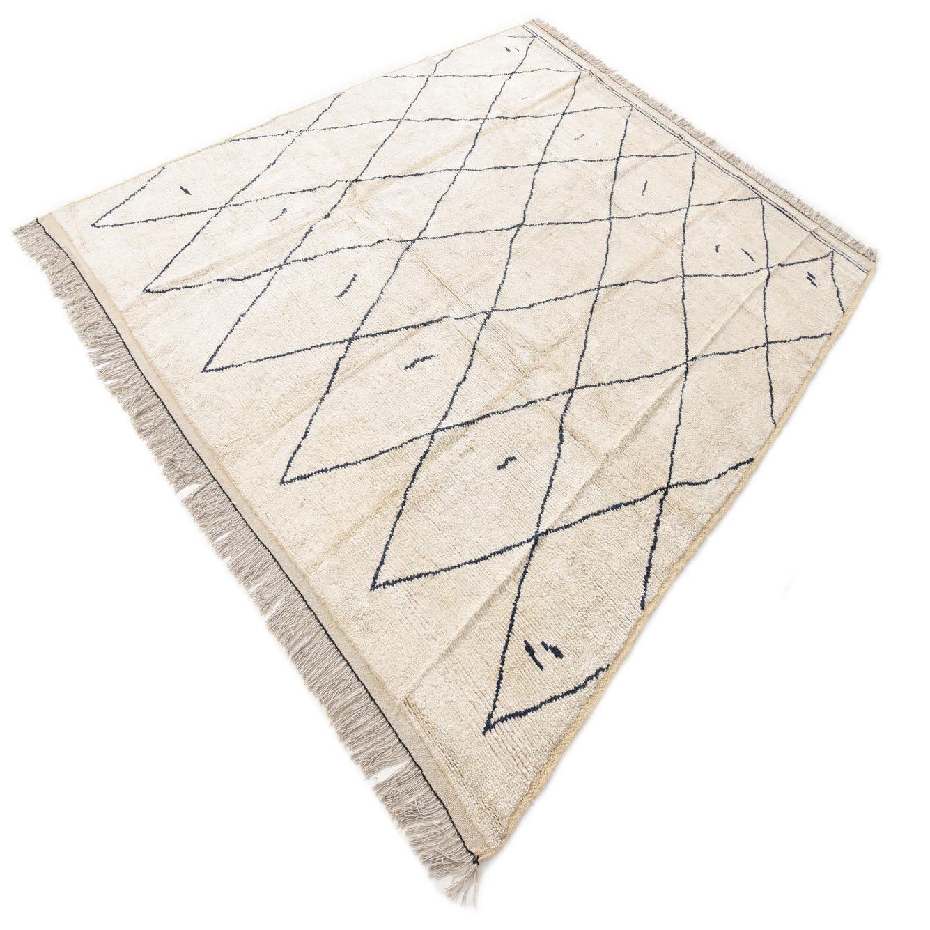A 9x12 rectangular ivory shag rug with a bold black diamond pattern and fringe, perfect for a living room.