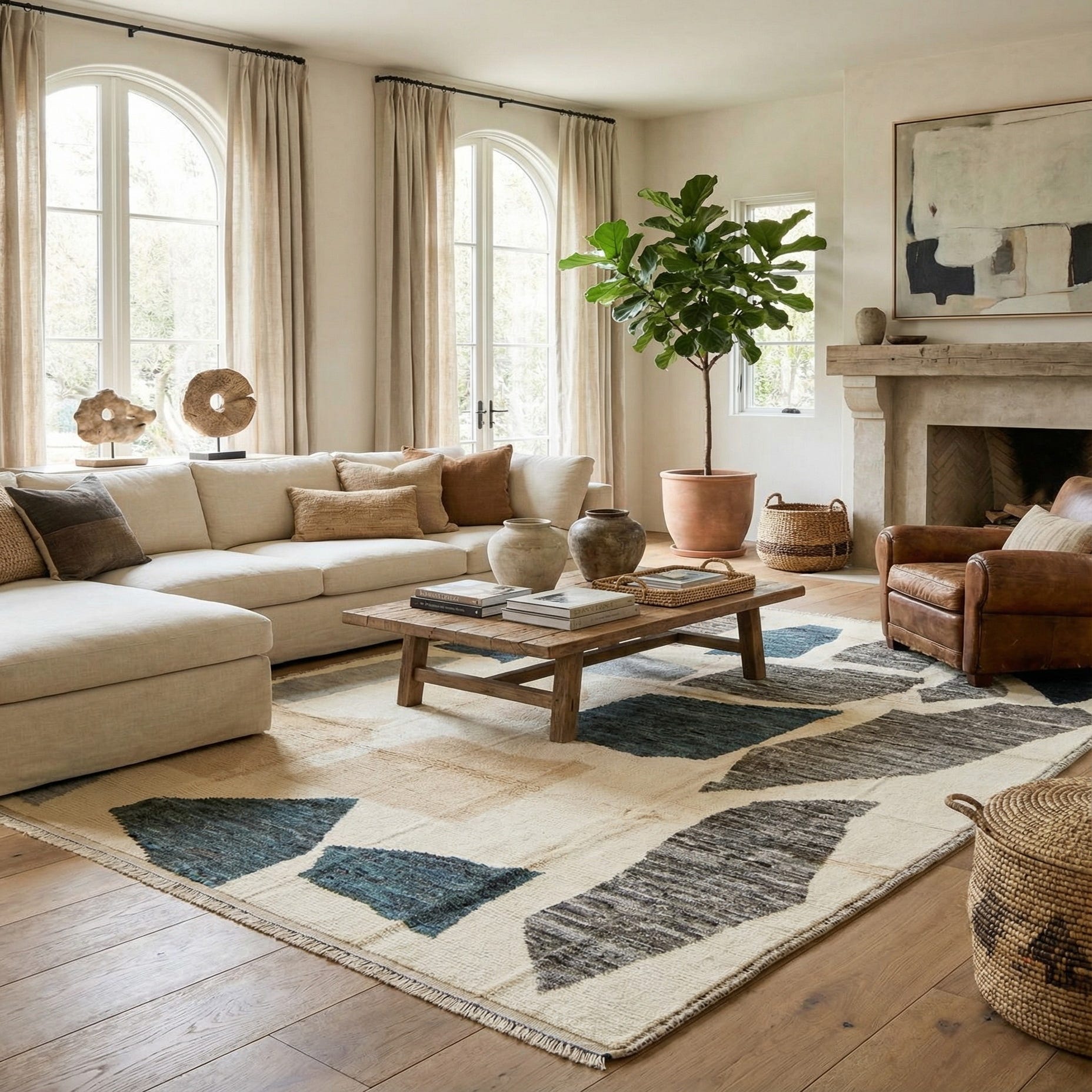 A 9x12 rectangular ivory wool shag rug with an abstract tribal pattern in shades of blue, gray, and brown.