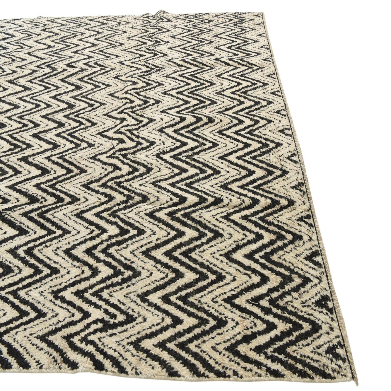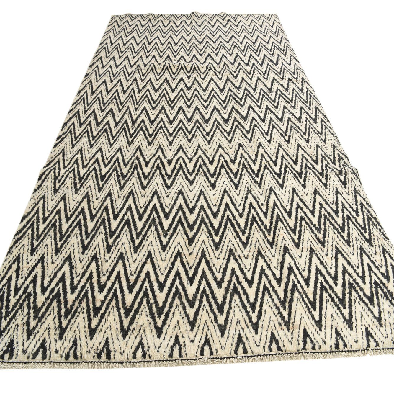 A 9x12 rectangular ivory and black tribal shag rug with a bold chevron pattern, suitable for a living room.