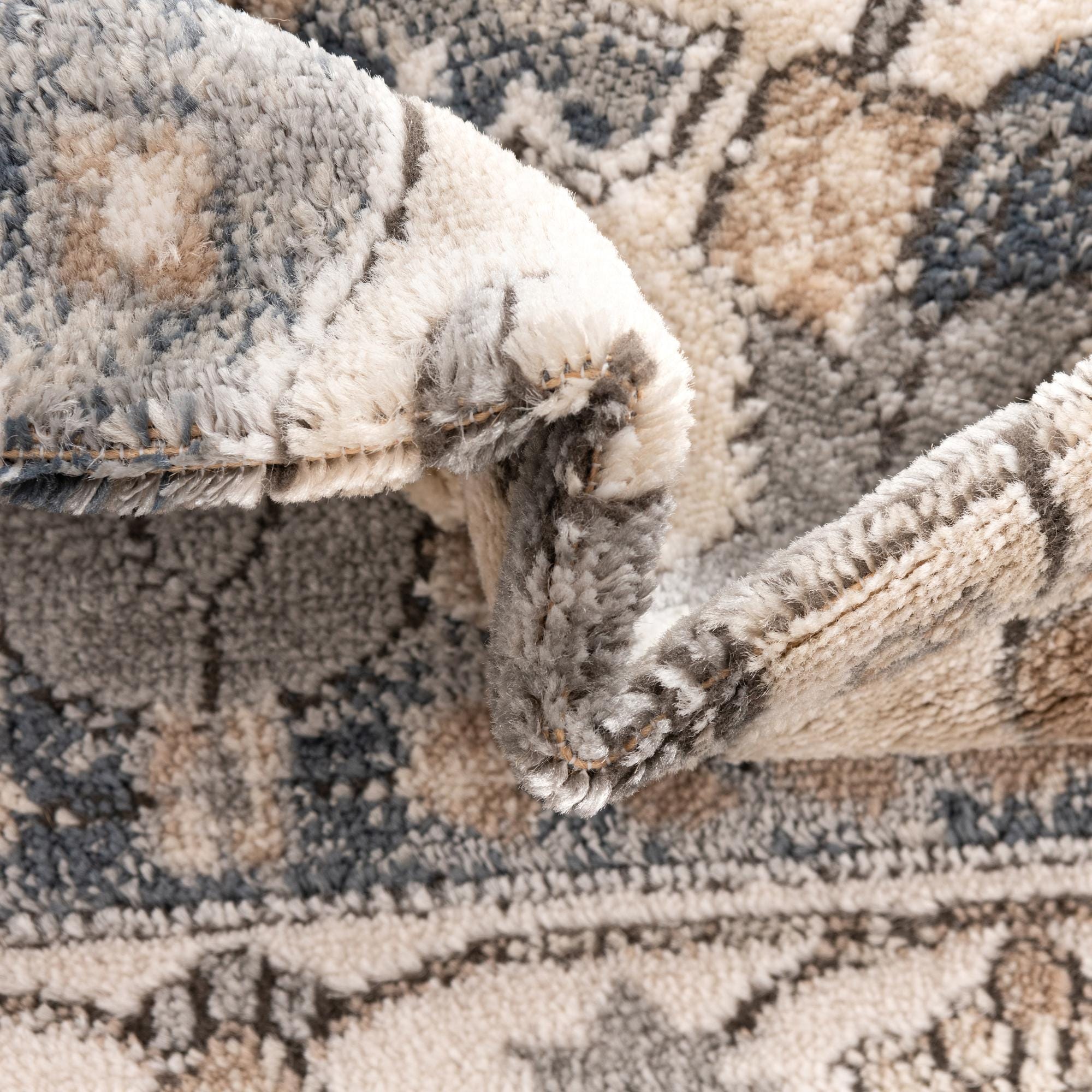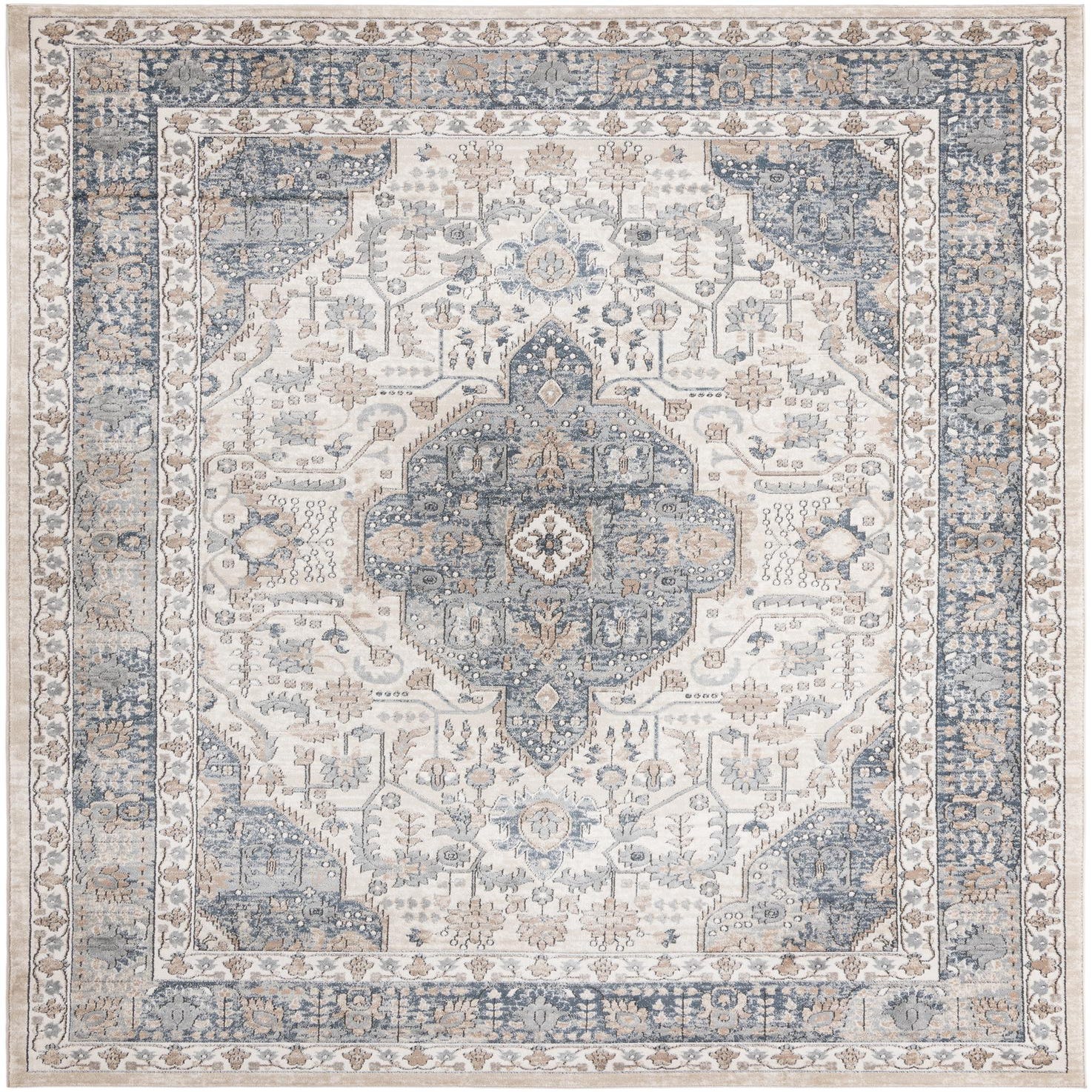 Primary color is Ivory. Colors in this rug include: Ivory, Beige, Gray, Navy Blue.