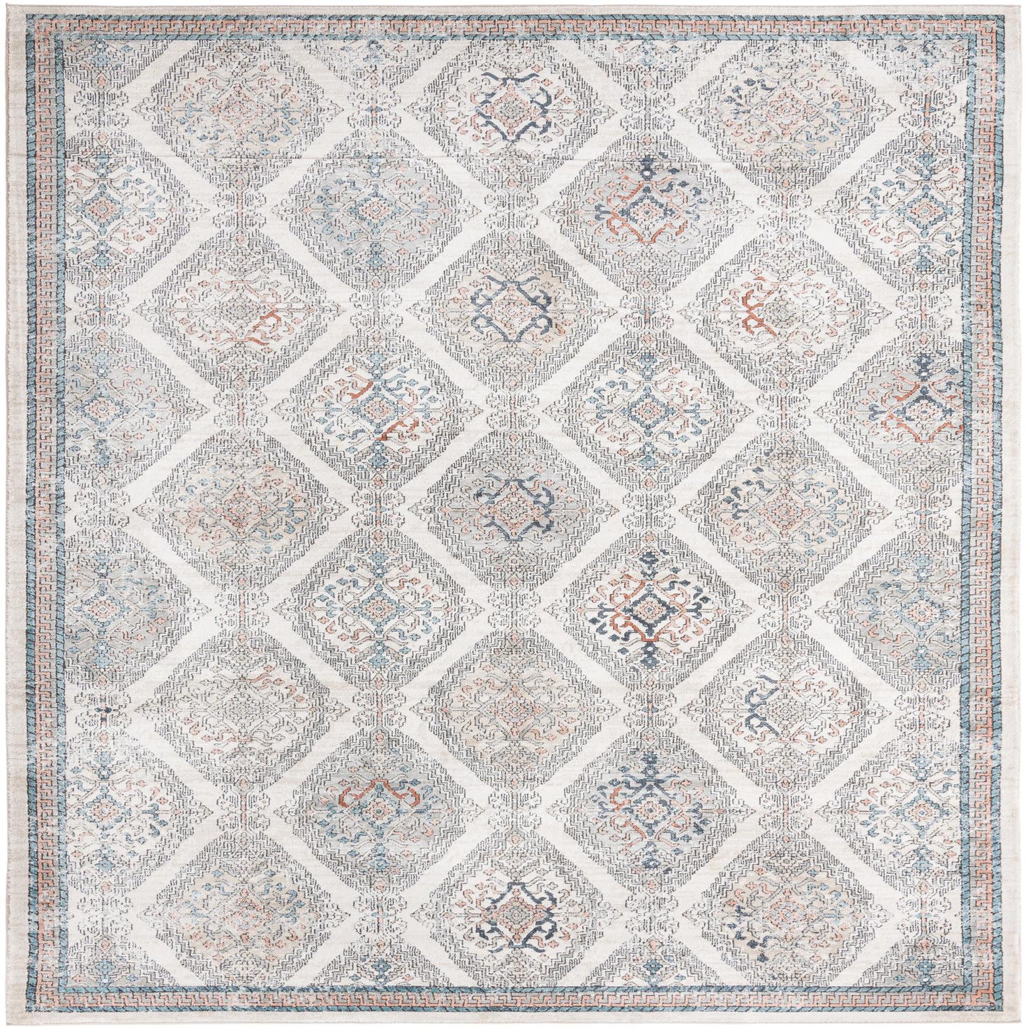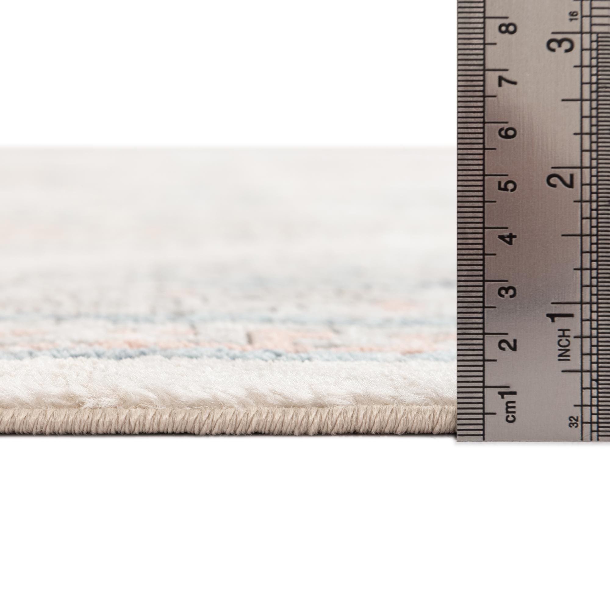 Primary color is Ivory. Colors in this rug include: Ivory, Blue, Gray, Light Blue, Navy Blue, Rust Red.