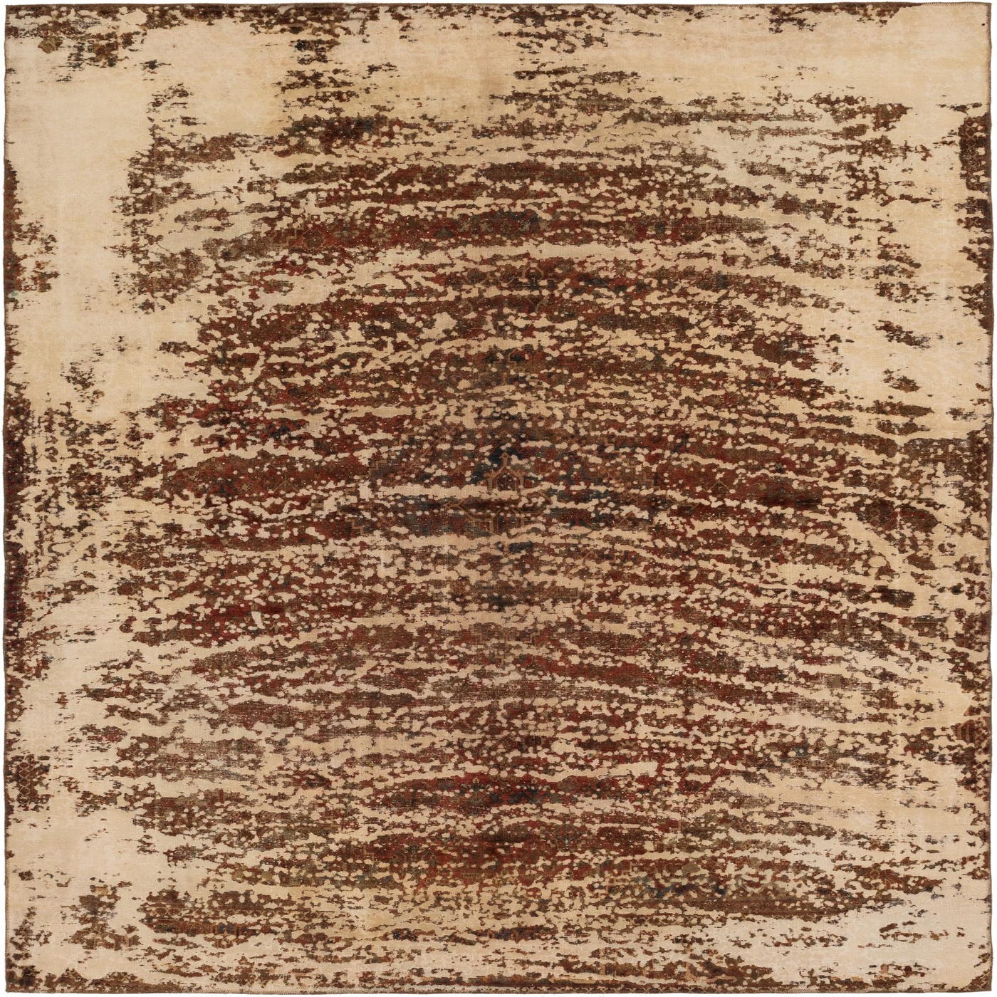A 9x12 rectangular ivory and brown wool rug with a distressed abstract pattern, suitable for a living room.