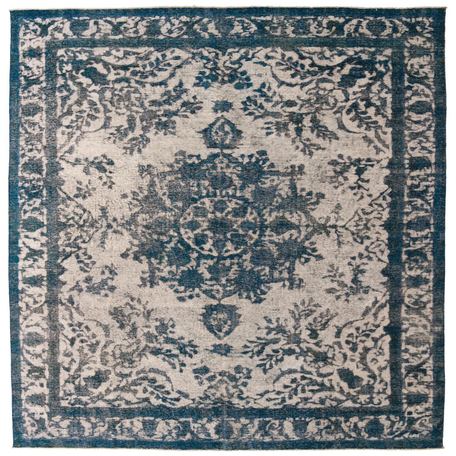 A 9x12 rectangular Ultra Vintage rug featuring a faded ivory and deep teal Persian medallion pattern with a decorative border.
