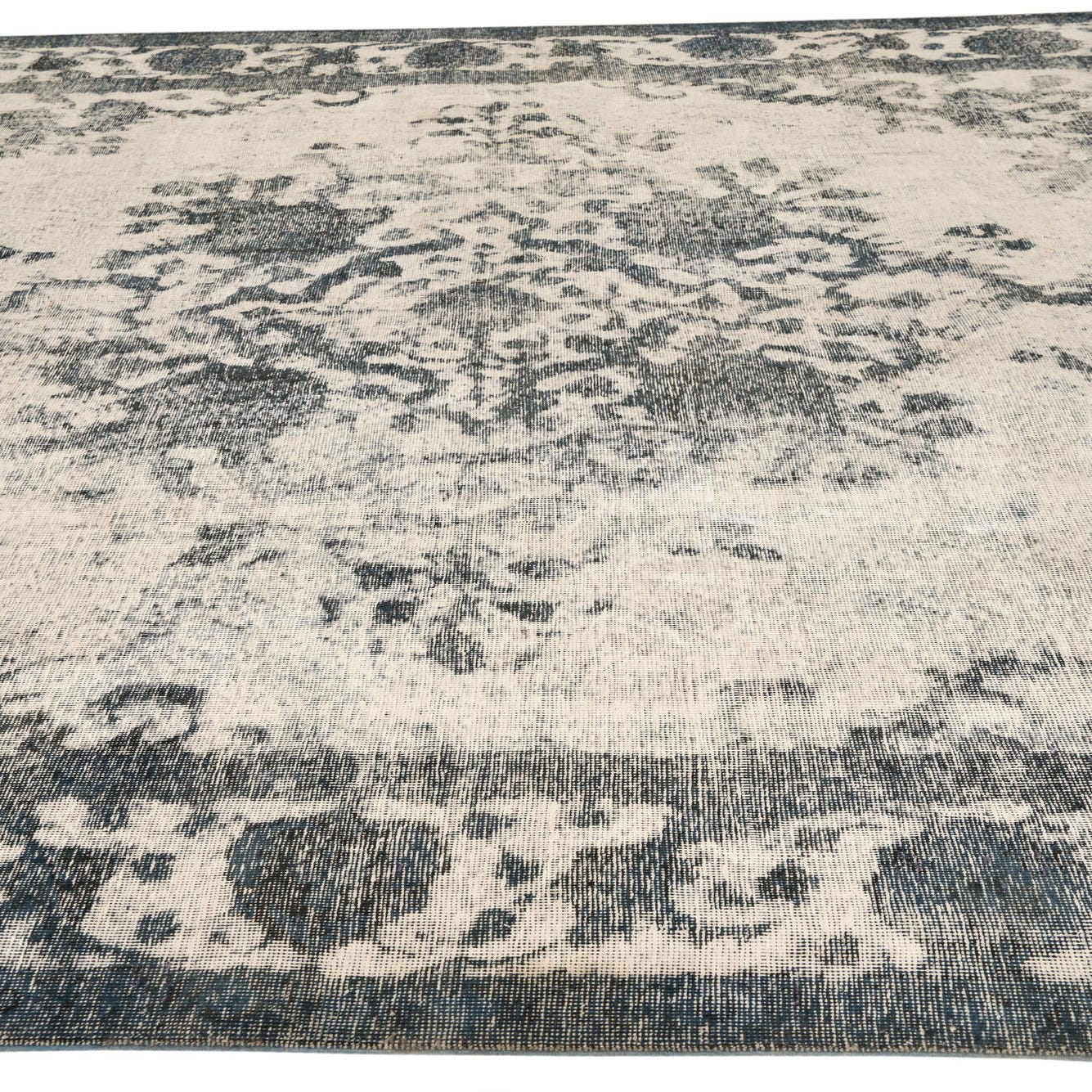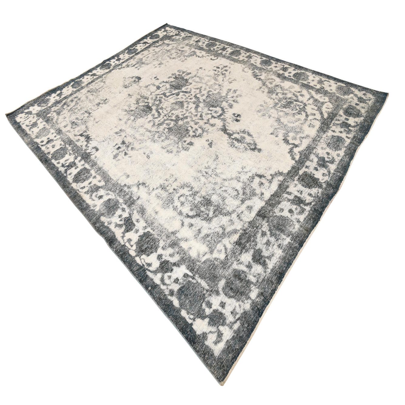 A 9x12 rectangular ivory and gray wool rug with a distressed Persian medallion pattern and ornate border.