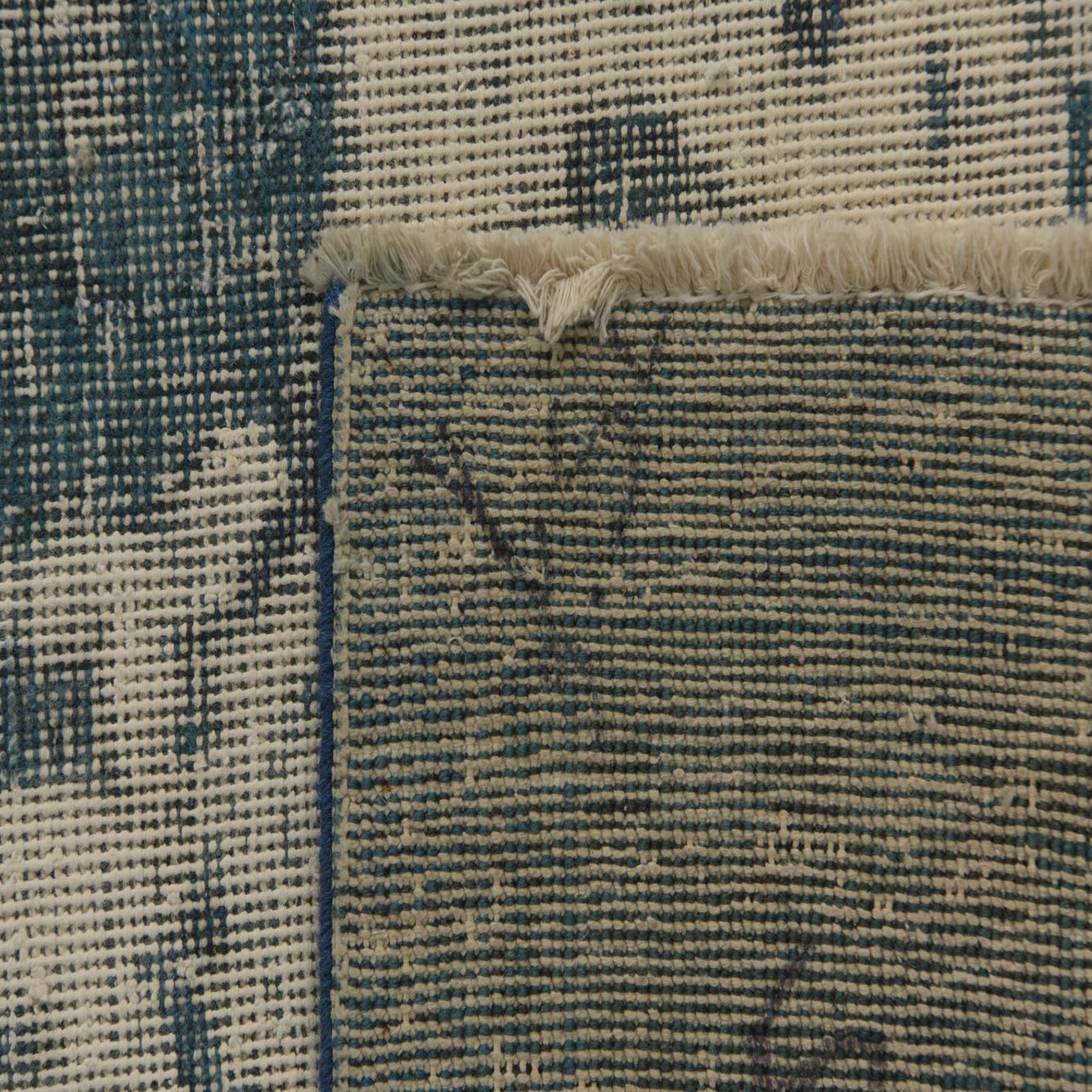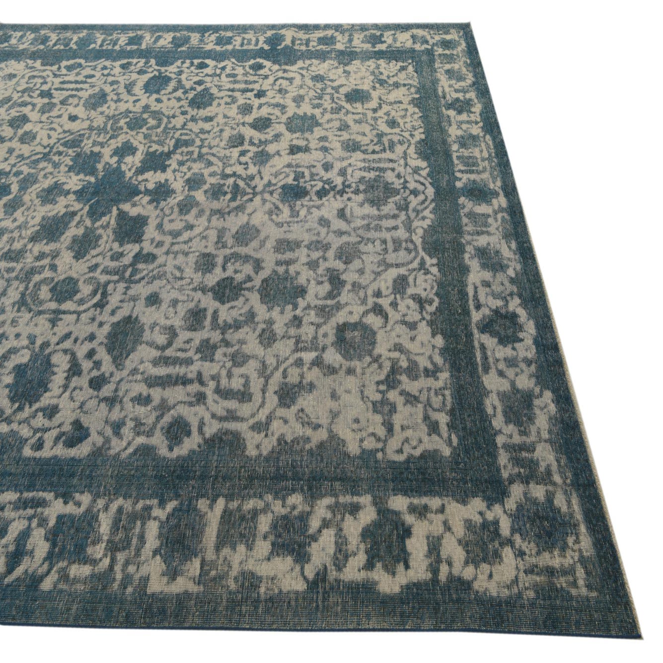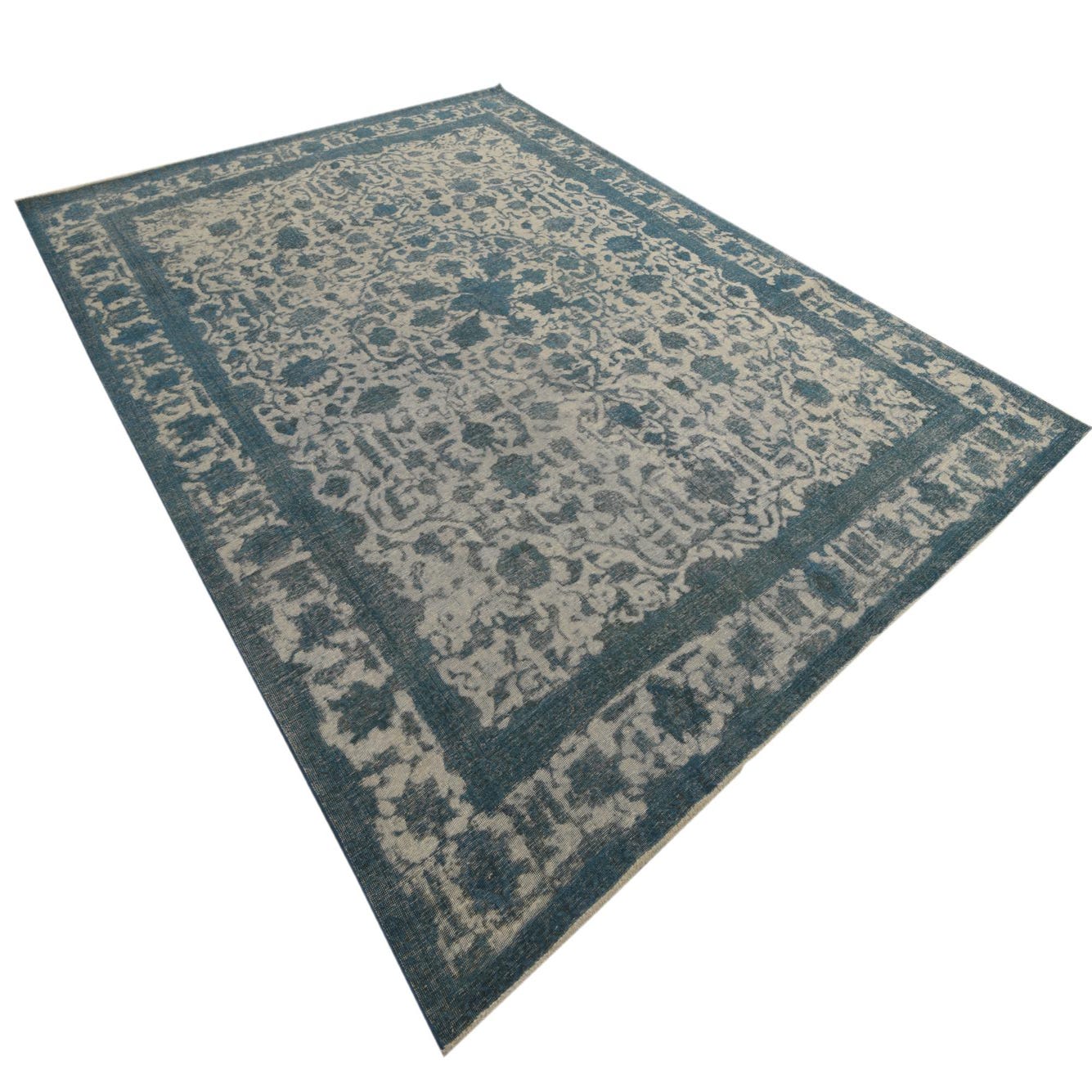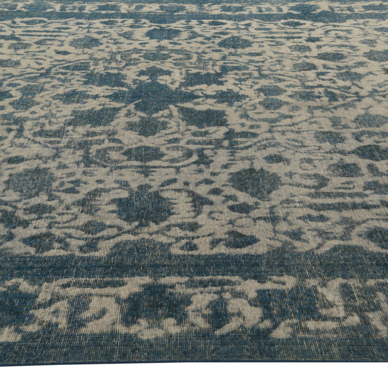A vintage-inspired medallion and floral pattern rests on an ivory ground, where distressed blue motifs and subtle black accents create depth and visual texture. The design reads like a timeworn Persian field—ornate scrollwork and a defined border softened by an intentionally faded finish. Hand-knotted in 100% wool, the rug has a low-to-medium pile with a tactile, natural wool hand; when you run your fingers across it you feel the dense, slightly irregular weave and the gentle pile variation that gives the surface a lived-in warmth.