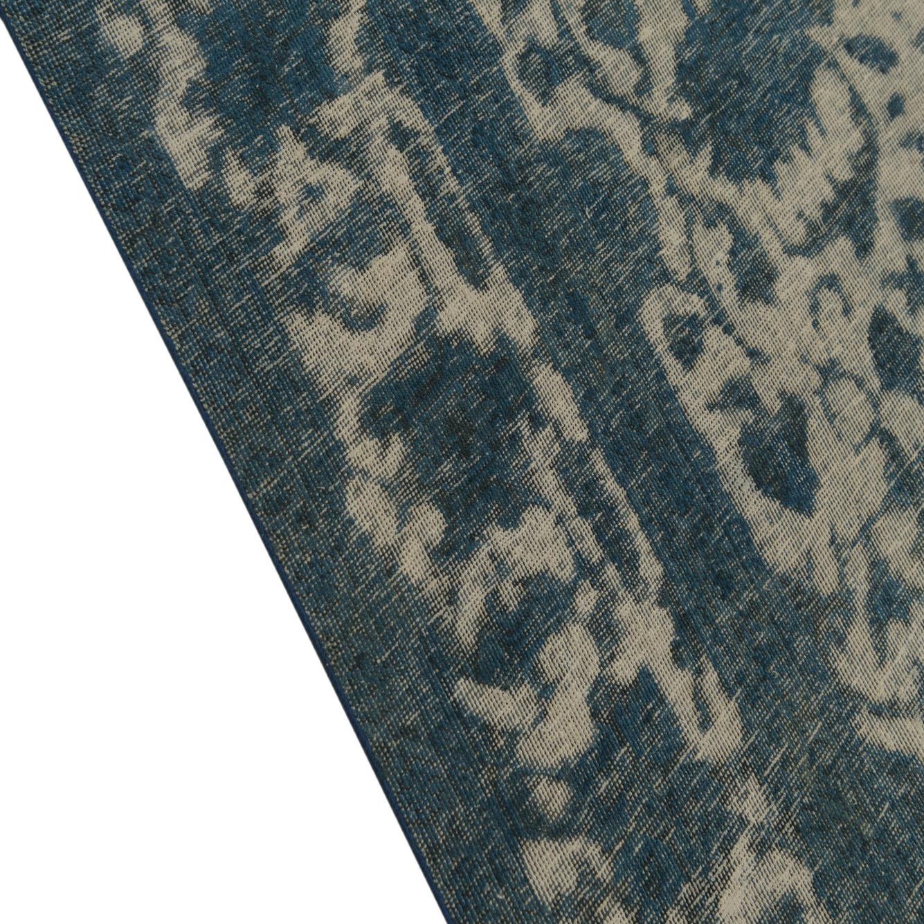 This rug pairs easily with warm wood furniture and linen upholstery, and it brings a grounded, layered look to transitional, coastal, or modern farmhouse interiors. Use it to anchor a seating arrangement in the living room, sit it beneath a dining table to add pattern without overwhelming the space, or layer it under the lower two-thirds of a bed to add softness at the foot. Combine with brass or matte-black metal accents and textured throws to highlight the blue and black tones while keeping the overall palette light and inviting.
