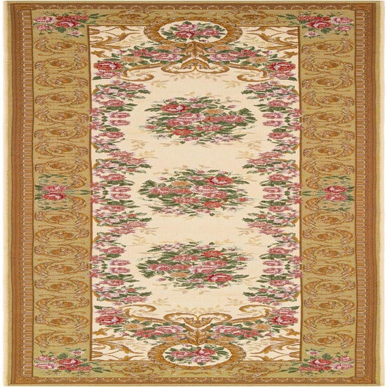 Primary color is Ivory and Beige. Colors in this rug include: Ivory and Beige, Gold, Green, Ivory, Light Blue, Red, Pink.