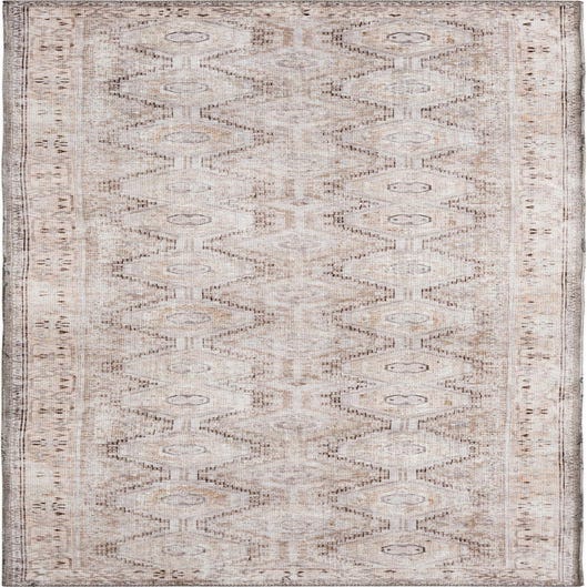 A 10 ft runner rug in shades of brown, tan, and cream with a distressed geometric pattern, perfect for a hallway.