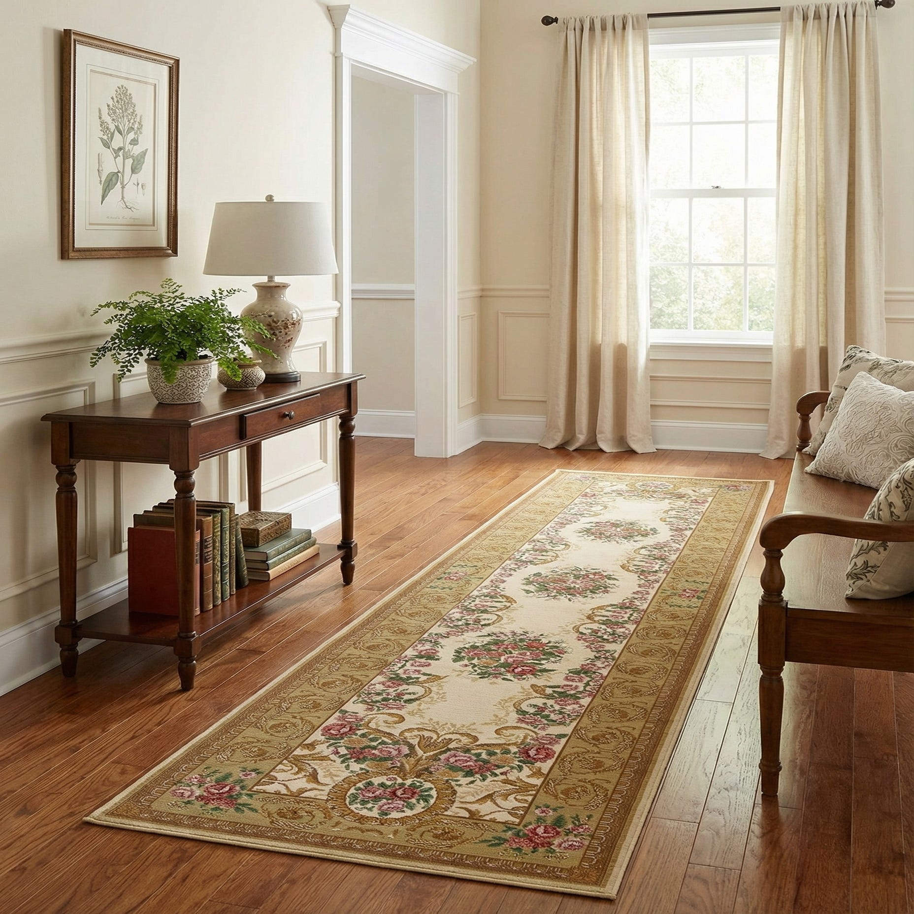 A 12 ft runner rug with a traditional floral design in browns, tans, and creams, featuring rose bouquets.
