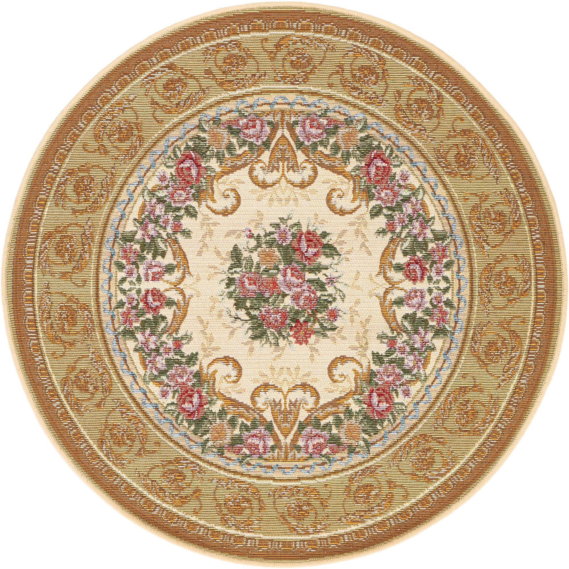 This round, traditionally styled rug centers on a classic floral medallion—a bouquet of red and pink roses framed by scrolling gold arabesques and a garland of leafy green vines. The background is a warm blend of ivory and beige that lets the gold outer border and its repeating rosette motif stand out, while small light-blue accents trace a delicate inner band. The patterned field and ornate border give the piece a formal, vintage-inspired look that reads as a time-honored classic.