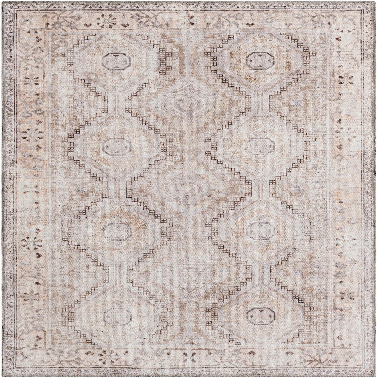 A softly distressed medallion pattern defines this machine-made rug, with a series of geometric octagonal and diamond motifs linked by stepped borders for a calm, orderly composition. The background is ivory and beige, while brown accents trace the medallions and border details, producing a layered, antique-inspired look that reads warm and subtle across a room.