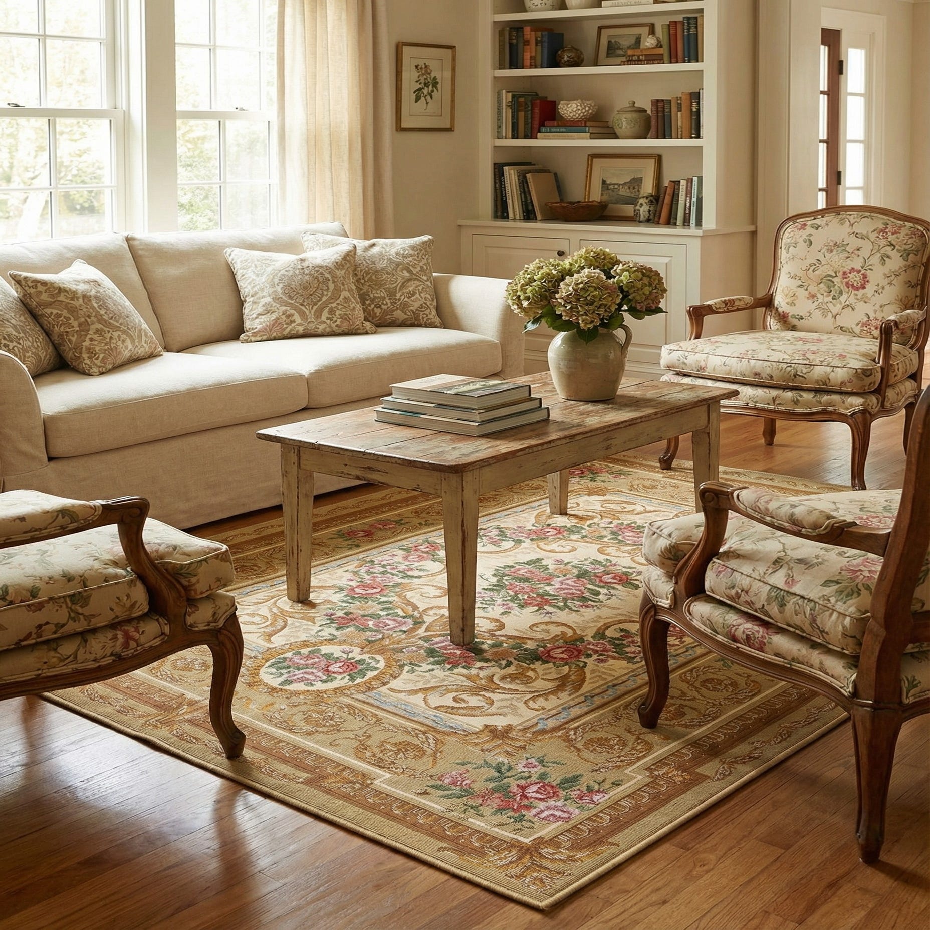 Primary color is Ivory and Beige. Colors in this rug include: Ivory and Beige, Gold, Green, Ivory, Light Blue, Red, Pink.