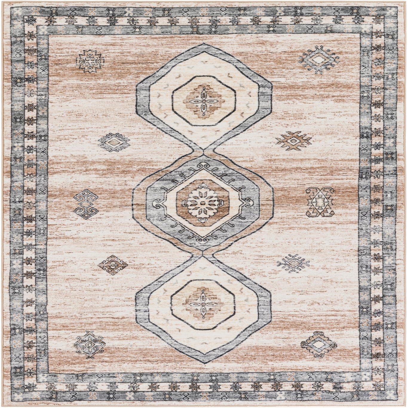 A softly aged field in ivory and beige sets the tone for this rug, with a gently striated background that brings warmth without overpowering the room. A vertical run of three linked medallions anchors the design, each outlined in muted gray and black with brown center accents, while small geometric motifs scatter across the field for added interest. A narrow, patterned border in gray frames the piece and gives a finished, traditional-meets-transitional look that pairs classic motifs with a relaxed, lived-in feel.