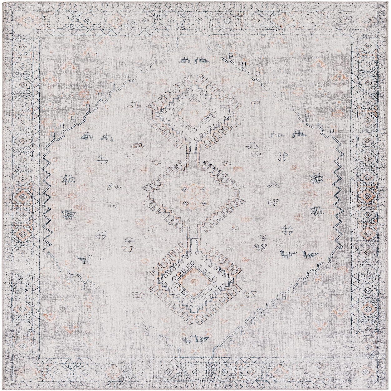 A soft, lived-in medallion design gives this rug a quietly vintage look. The ivory-and-beige ground is lightly distressed, allowing black, gray and gold motifs to appear as gentle accents rather than bold contrasts. A trio of diamond medallions runs down the center, framed by a narrow patterned border and scattered miniature motifs that add visual interest without crowding the field. The overall effect is understated and adaptable — the palette and wear-pattern feel intentional and restrained.