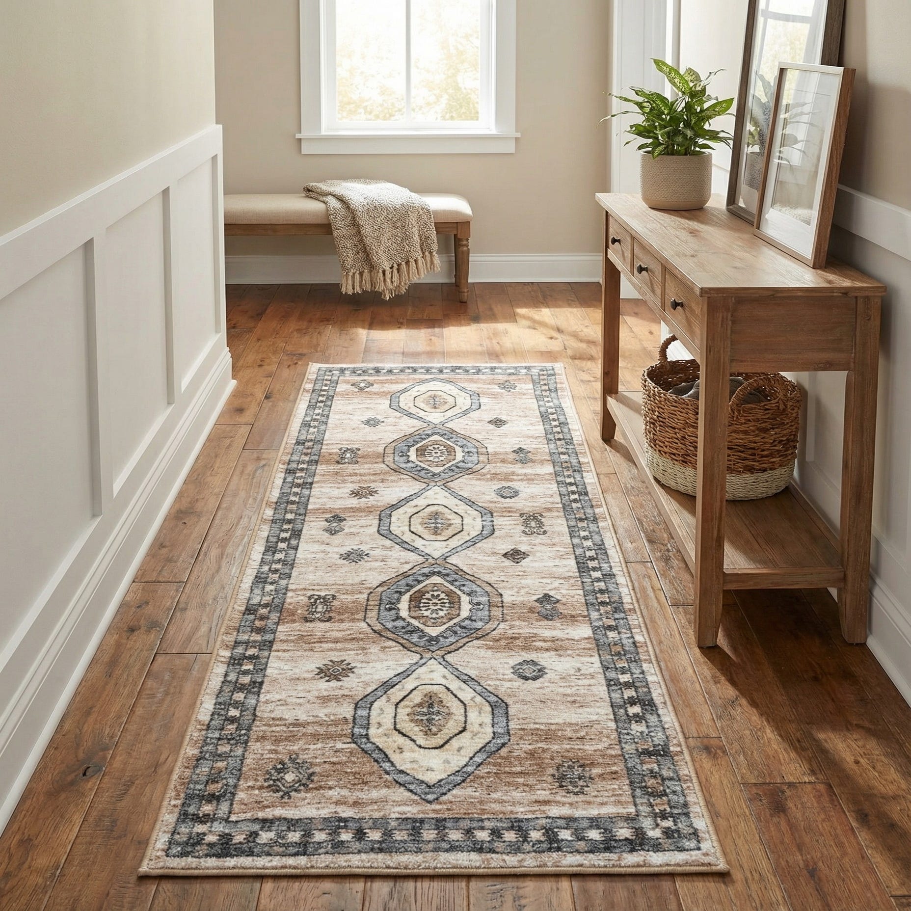 Underfoot the surface feels smooth with a gentle, brushed texture typical of polyester construction. The neutral palette and balanced pattern make this runner versatile: place it in a hallway or entry to anchor narrow circulation spaces, use it in a kitchen galley for a touch of warmth beneathfoot, or layer it in a living area to tie together wood tones and leather seating. It pairs well with warm wood floors, matte-black accents, and linen or neutral upholstery for a relaxed, transitional look.