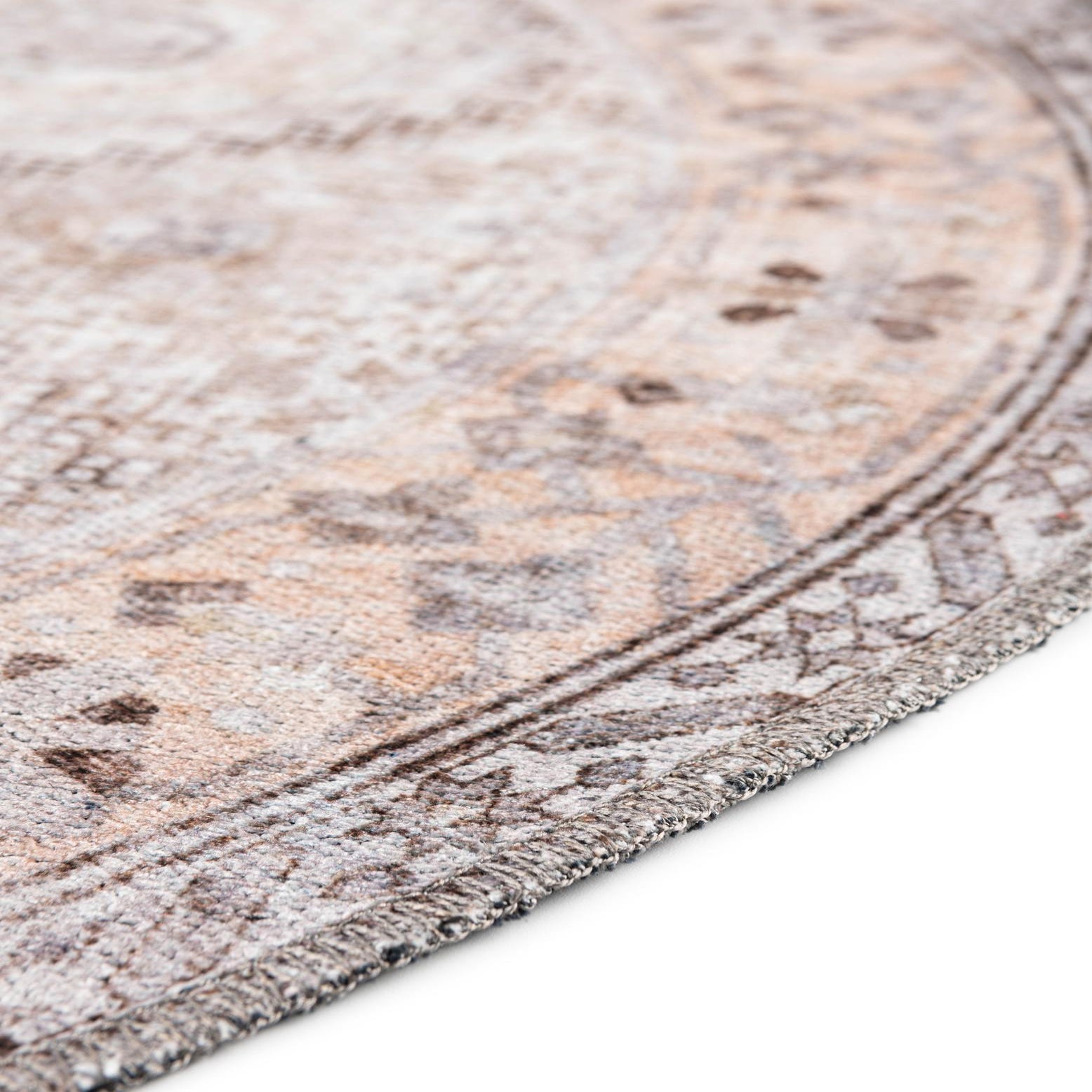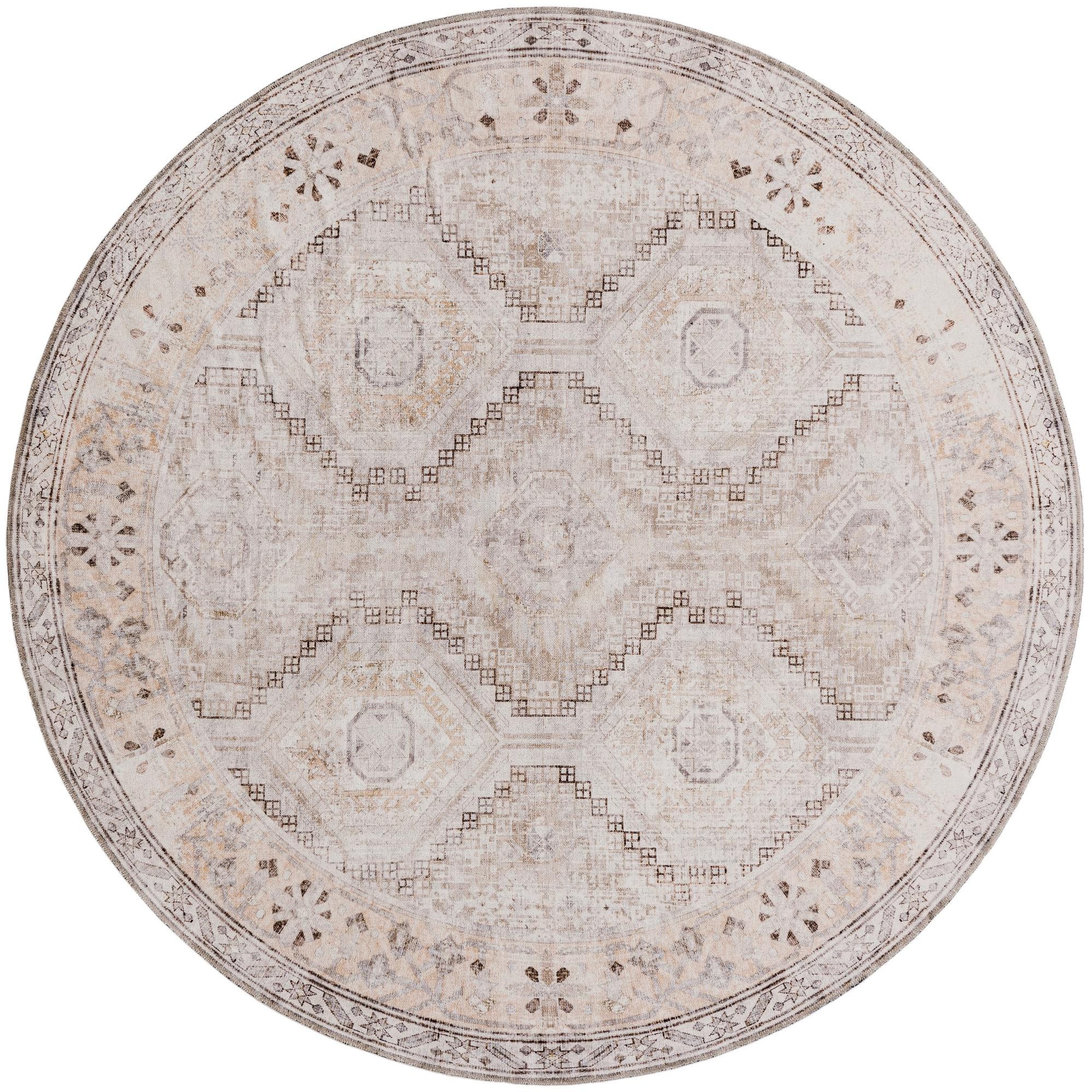 A softly weathered geometric medallion pattern gives this round rug a relaxed, vintage-inspired look. The ivory and beige background provides a light, airy base while brown accents trace stepped hexagonal motifs and a narrow floral border for subtle contrast. Machine-made construction in polyester and chenille creates a layered texture you can feel: velvety chenille areas offer a plush, touchable surface while polyester sections hold finer pattern definition and a low-profile finish underfoot.