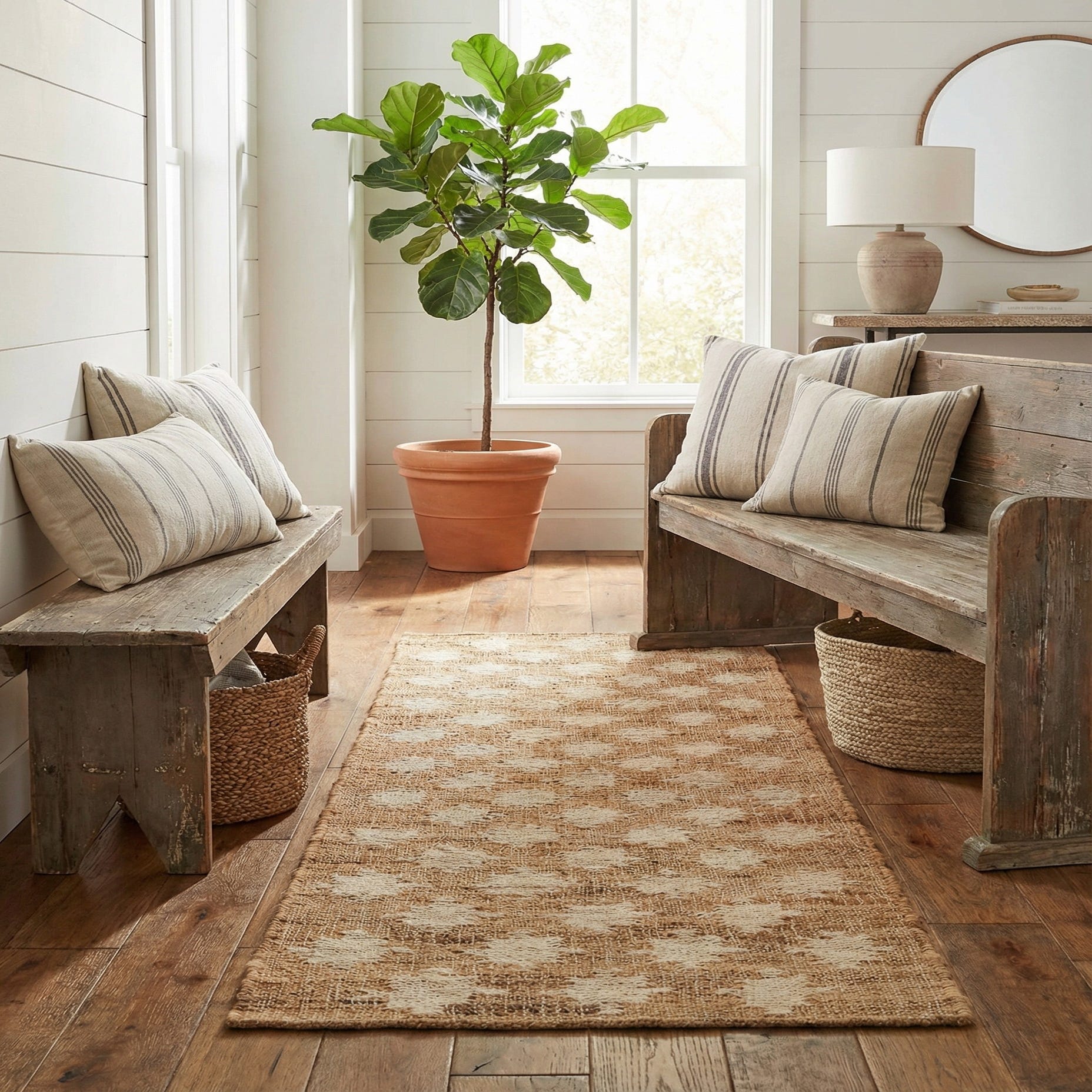Hand-woven of cotton and jute, this runner pairs a warm beige jute ground with soft ivory motifs set in a loose, staggered pattern. The weave reads as intentionally irregular—small, cloud-like geometric shapes float across the surface—while the cotton highlights lift the motifs slightly above the jute for a subtle, tactile contrast. Underfoot the jute provides a firm, natural texture and the cotton adds a low-profile softness, giving the rug visible depth without a high pile.