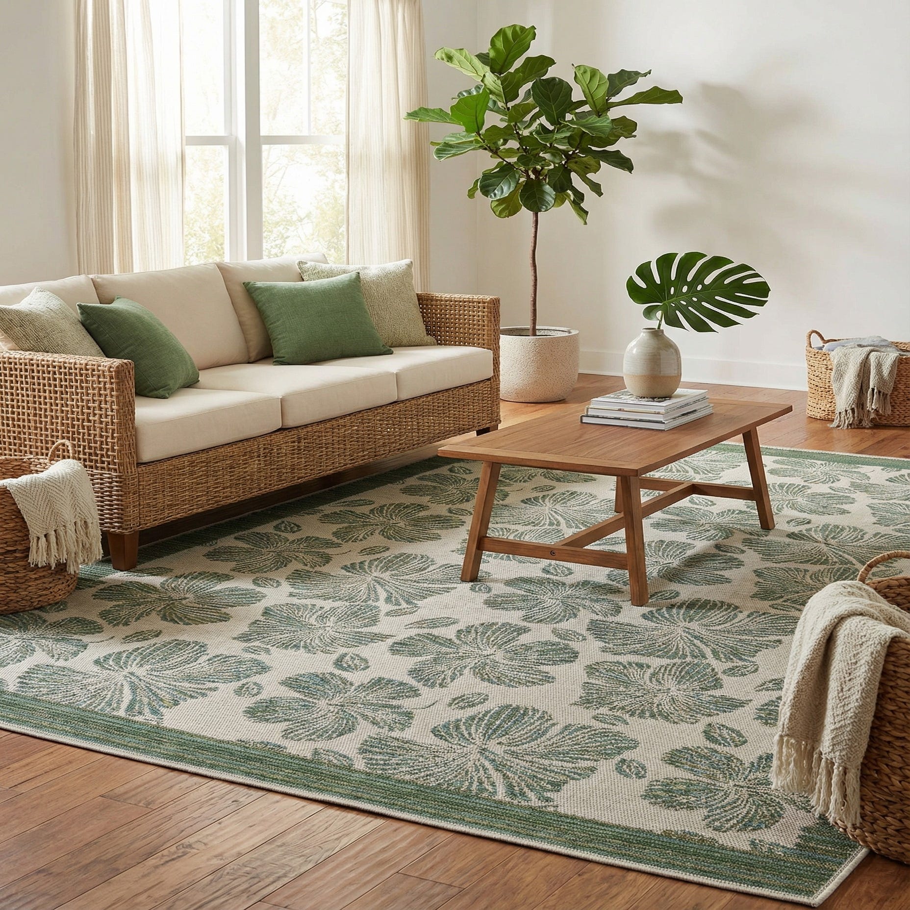 This piece's neutral color palette and resilient material make it an excellent choice for patios, decks, dining areas, and living spaces seeking a touch of understated elegance. It pairs gracefully with natural wood furnishings, wicker patio sets, and complements spaces accented with greenery. Whether integrated into a minimalist, coastal, or contemporary aesthetic, this rug anchors your space with ease and sophistication.