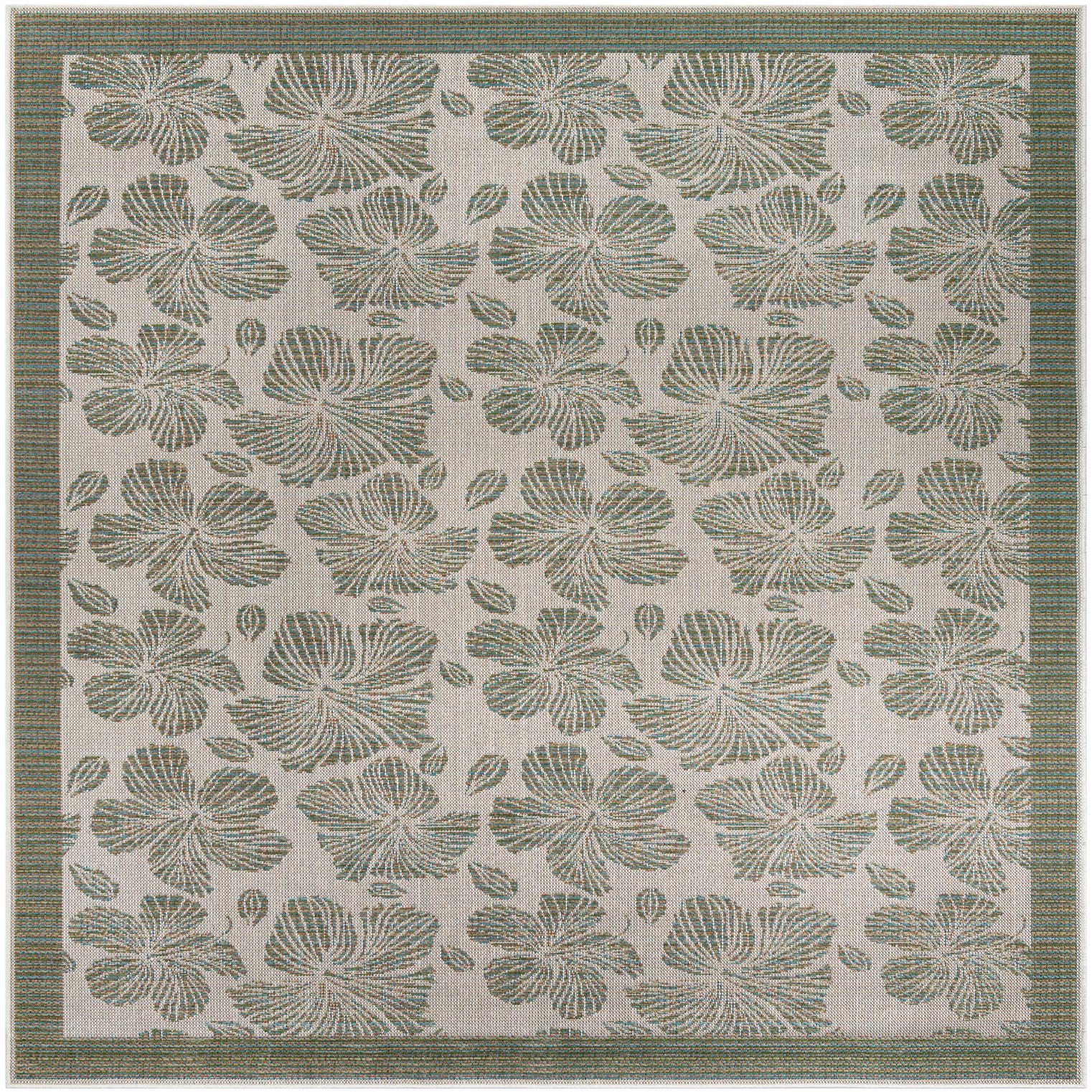 8x10 rectangular indoor/outdoor rug with a modern brown and ivory hibiscus pattern and a striped border.