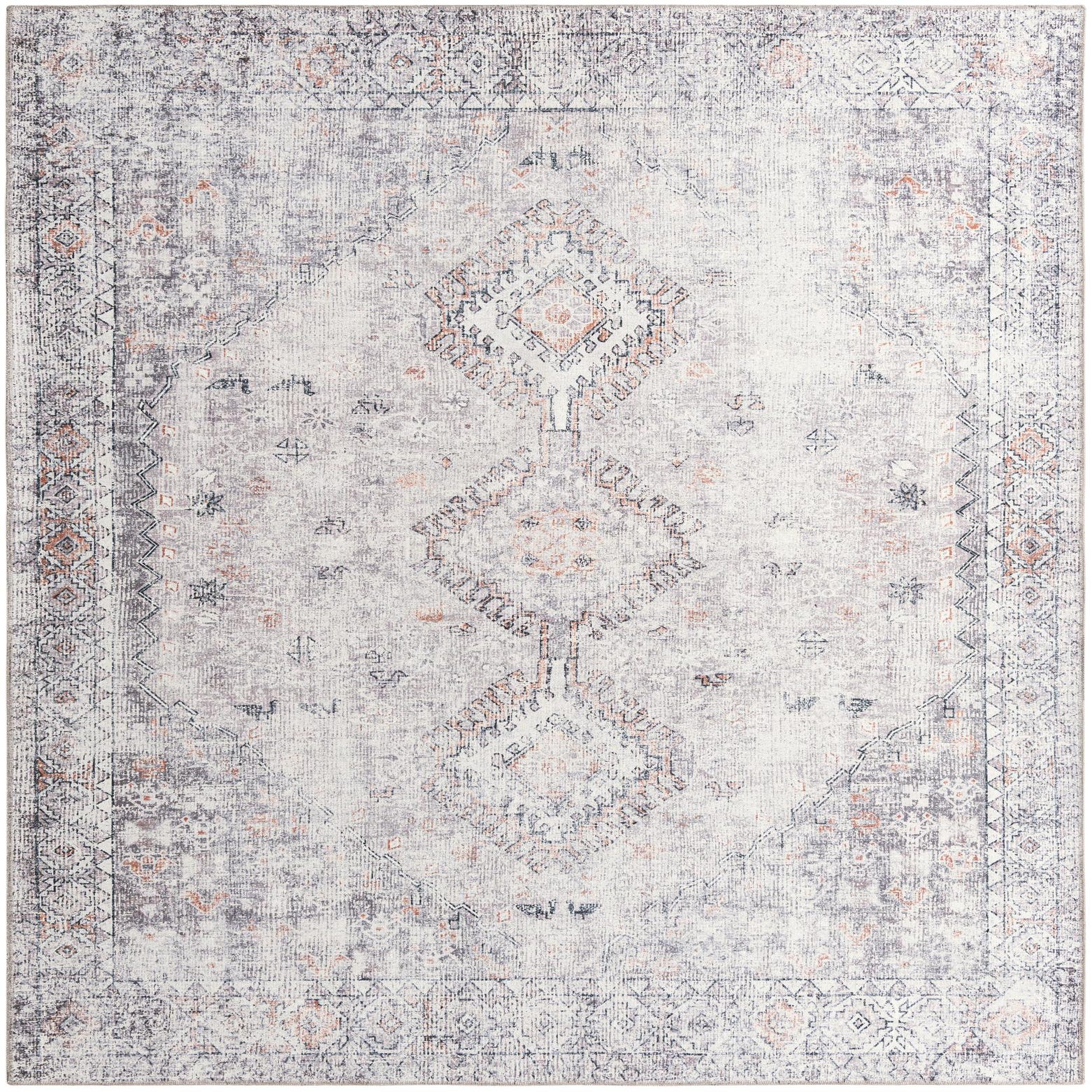A soft, vintage-inspired medallion pattern runs down the center of this rug, where three geometric diamond motifs connect through a gently distressed field. The background is ivory and beige, with charcoal-black, soft gray and warm gold accents that highlight the border and inner motifs. Machine-made from polyester and chenille, the surface combines chenille’s plush cut pile with lower polyester areas to create a subtle, tactile texture and a low-profile feel underfoot.