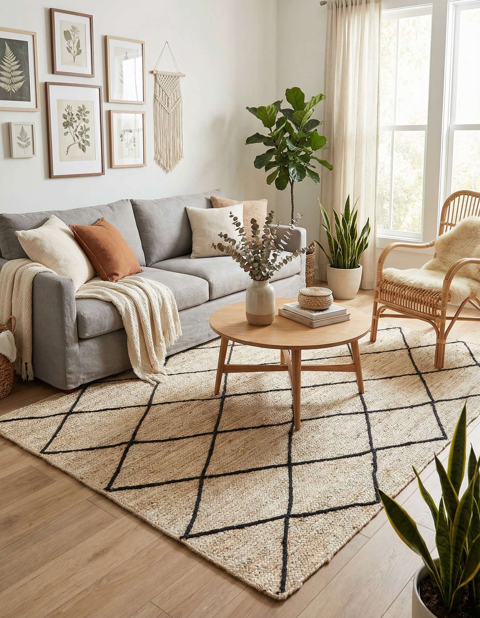This rug suits relaxed, layered interiors — think coastal and bohemian living rooms, modern farmhouse dining spaces, or a Scandinavian-inspired entry where natural materials take center stage. It pairs nicely with light wood floors, linen upholstery, leather accents, and black metal fixtures; use it to anchor a seating area, define a dining spot, or add texture to a sunroom or covered porch.
