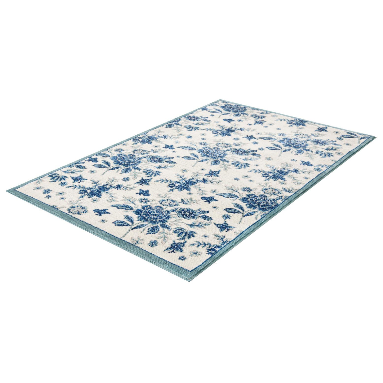 A 3x5 rectangular indoor rug with a dense pattern of blue floral motifs and leaves on a cream background, framed by a solid blue border.