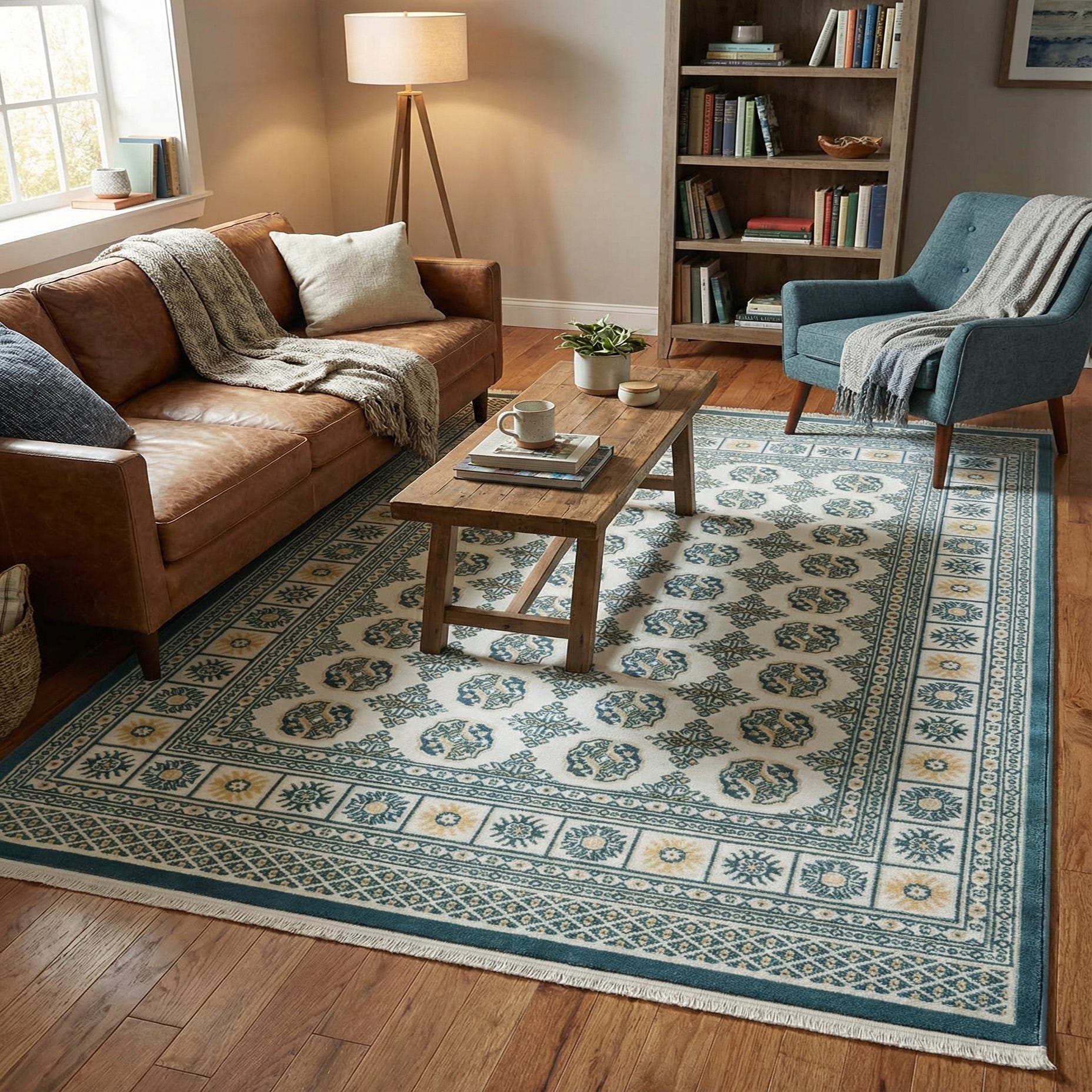 This rug works well in compact living areas where a patterned anchor is needed — think an entry, a cozy seating nook, a home office, or at the foot of a bed. It pairs naturally with light woods, linen upholstery, and simple blue or neutral accessories for a calm, put-together feel; it also complements more traditional furnishings when layered beneath a small coffee table or tucked beneath a reading chair.