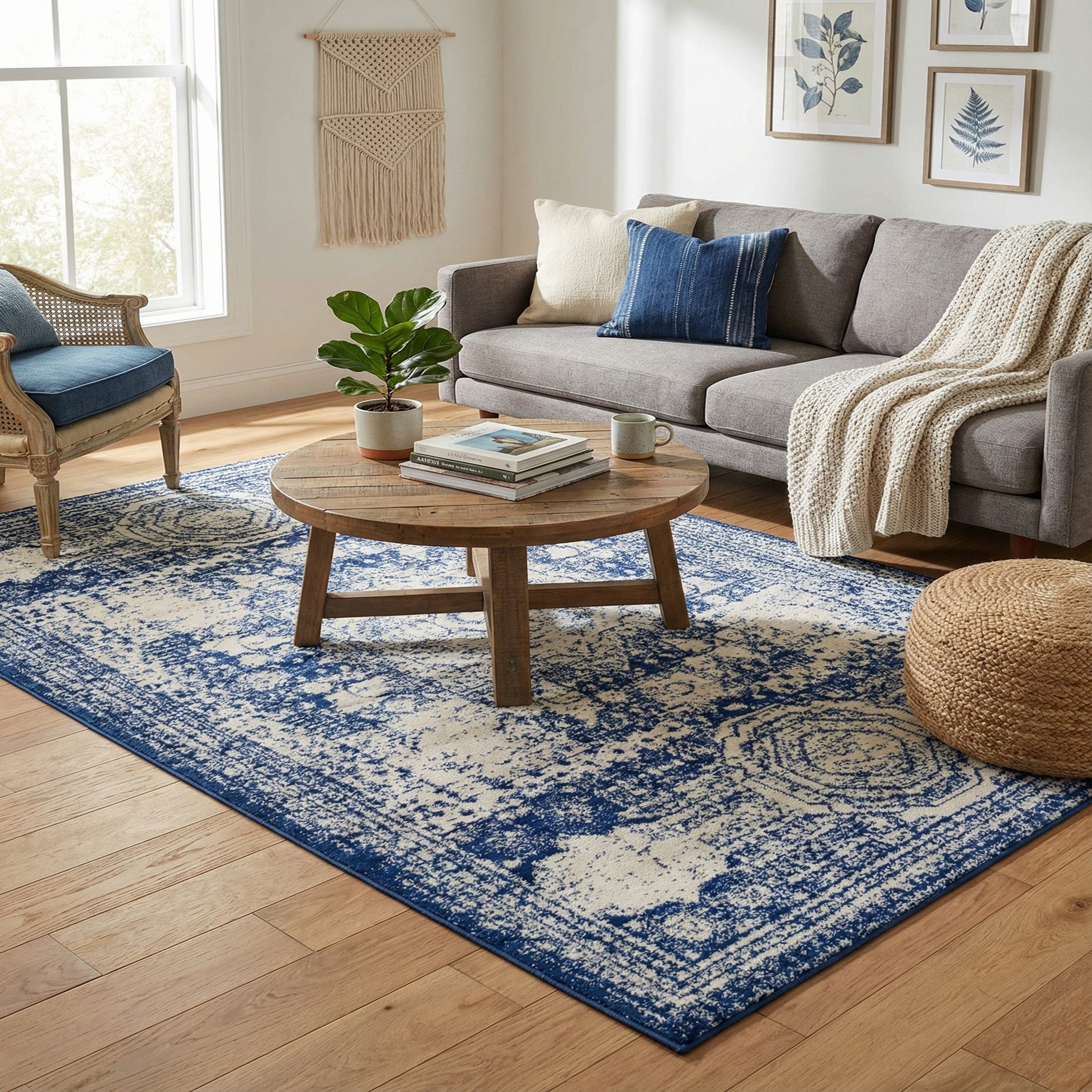 This colorway and style work well in coastal, transitional, or modern farmhouse settings—pair it with navy or white upholstery, weathered wood pieces, or brushed metal accents. Use it to anchor a living room seating group, beneath a dining table to add pattern without overwhelming the space, or in an entryway or hallway to introduce visual interest and a comfortable underfoot feel.