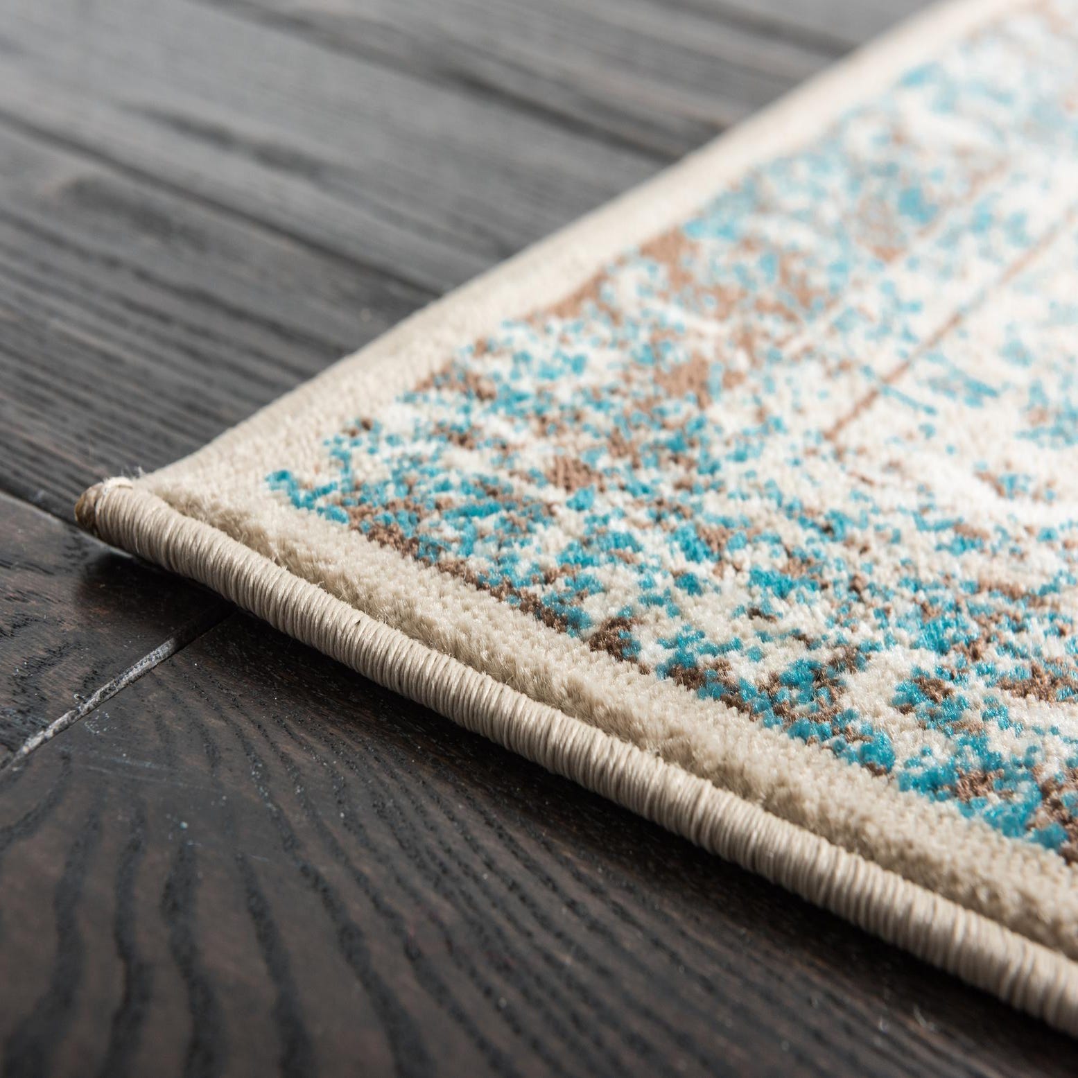 The Ankara collection presents a contemporary, machine-woven 6 Ft runner rug crafted from 100% polypropylene, ensuring a durable and easy-to-maintain surface. This rug boasts an engaging abstract pattern, where splashes of teal and blue beautifully adorn the ivory and blue background, interspersed with delicate touches of brown and cream. The fusion of colors creates a visually dynamic piece, while the distressed finish adds character and a modern twist to the traditional design.
